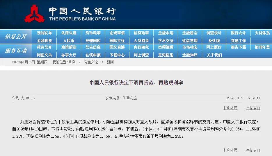 货币政策工具调整 - 自2026年1月19日起,下调再贷款、再贴现利率0.25个百分点,下调后3个月、6个月和1年期支农支小再贷款利率分别为0.95%、1.15%和1.25%,再贴现利率为1.5%,抵押补充贷款利率为1.75%,专项结构性货币政策工具利率为1.25% [4][7] - 合并使用支农支小再贷款与再贴现额度,增加支农支小再贷款额度5000亿元,并在总额度中单设一项额度1万亿元的民营企业再贷款,重点支持中小民营企业 [10] - 2025年各项公开市场操作累计净投放6万亿元,其中买断式回购净投放3.8万亿元,净买入国债1200亿元 [10] 房地产金融政策 - 会同金融监管总局将商业用房购房贷款最低首付比例下调至30%,以支持推动商办房地产市场去库存,此前商业用房首付比例一般为50%或45% [4][9] - 商业用房一般包括商铺、写字楼、商务公寓、酒店、商业综合体等经营性房产,其贷款利率高于住宅 [9] 金融支持实体经济成效与空间 - 2025年社会融资规模增量中,债券等贷款以外的融资方式占比已超过50%,金融供给侧结构性改革成效显著 [6][7] - 2025年12月末,社会融资规模存量同比增长8.3%,广义货币(M2)供应量同比增长8.5%,明显高于名义经济增速,信贷支持力度持续较强 [8] - 目前金融机构法定存款准备金率平均为6.3%,降准仍有空间 [8] - 2025年以来银行净息差已出现企稳迹象,连续两个季度保持在1.42%,2026年还有规模较大的长期存款到期重定价,为降息创造一定空间 [8] 汇率政策与展望 - 中国无意通过汇率贬值来获取国际贸易竞争优势,2025年末人民币对美元汇率“破7”主要因中美经贸形势趋于缓和、美元指数走弱 [11] - 人民币汇率预计将继续双向浮动、保持弹性,宏观经济基本面长期向好对汇率基本稳定形成支撑 [11] 物价与货币政策目标 - 2025年12月CPI同比上涨0.8%,回升至2023年3月以来最高水平,PPI同比降幅较2025年7月低点收窄1.7个百分点,环比连续三个月上涨 [12] - 下阶段货币政策的重要考量是促进经济稳定增长和物价合理回升,将继续实施适度宽松的货币政策,为推动物价合理回升营造适宜的货币金融环境 [12] 其他改革与措施 - 将推动明示贷款综合融资成本,组织银行会同企业填写“贷款明白纸”,详细明示利息和非利息成本,以促进降低融资中间费用 [8] - 随着货币政策工具箱不断丰富,将完善基础货币投放和操作工具定价机制,并加强货币政策操作的信息披露以增强政策透明度 [10]