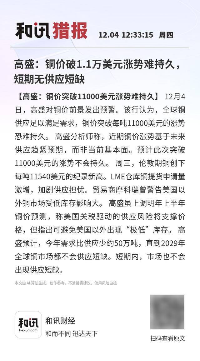 高盛对铜价前景的预警 - 核心观点:高盛认为全球铜供应足以满足需求,近期铜价突破每吨11000美元的涨势基于未来供应趋紧预期而非当前基本面,预计此轮涨势不会持久 [1] 近期市场动态与价格表现 - 伦敦期铜在周三创下每吨11540美元的纪录新高 [1] - LME仓库铜提货申请量激增,加剧了市场对供应的担忧 [1] - 贸易商摩科瑞曾警告,美国以外的铜市场受到低库存的显著影响 [1] 供需基本面分析 - 高盛预计,今年铜需求比供应少约50万吨 [1] - 该行预测,直到2029年,全球铜市场都不会出现供应短缺 [1] - 短期内,市场同样不会出现供应短缺 [1] 价格预测与风险因素 - 高盛上调了明年上半年的铜价预测,理由是“美国关税驱动的供应风险”将对价格构成支撑 [1] - 高盛同时指出,美国以外的市场可以避免出现“极低”的库存水平 [1]