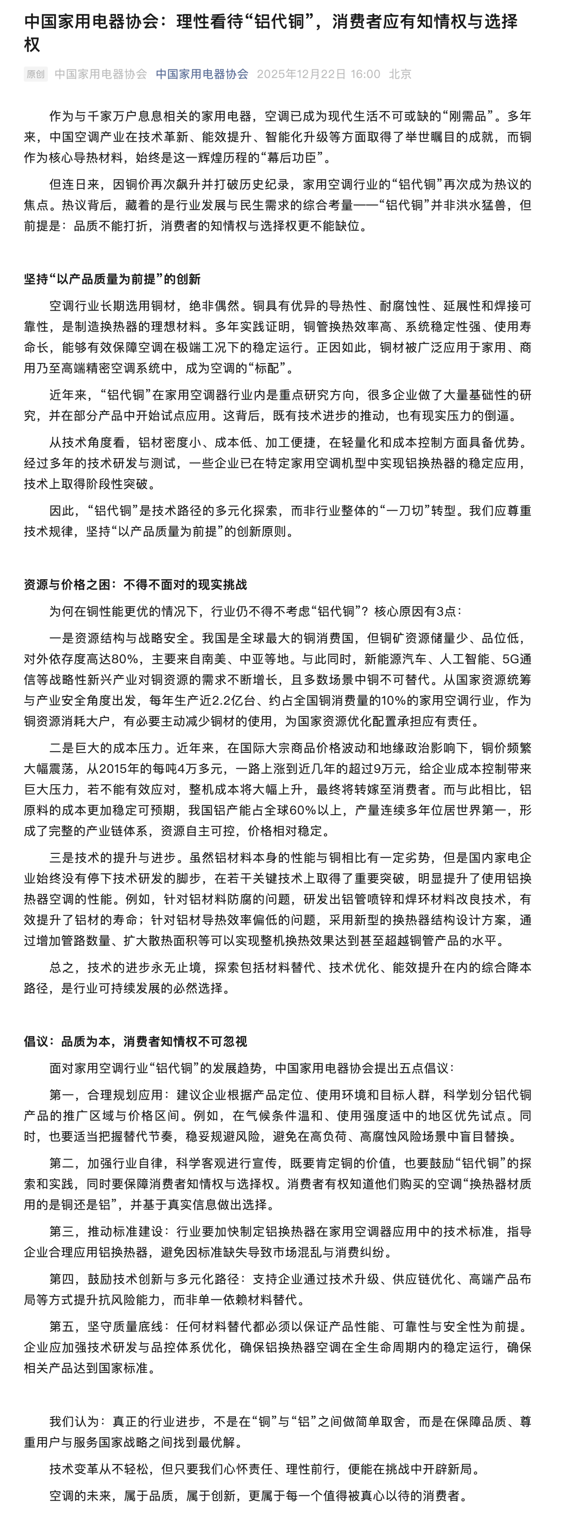 格力电器对“铝代铜”的立场与技术考量 - 格力电器表示铜是空调核心原材料,占空调成本的20%左右,尽管铝材成本约为铜材的1/12(价格约为1/4,密度约为1/3),但在熔点、热传导系数、电阻率、耐腐蚀及长期可靠性等方面与铜存在较大差距 [1] - 格力电器董事长董明珠称,如果用铝代铜,一台空调相差488块原材料成本,在技术研究没有100%确定时,暂时不允许使用铝 [1] - 公司重视铝代铜技术研究并持续关注行业动态,但坚持在铝的性能、质量和可靠性不能完全保证的情况下,暂时没有铝代铜计划 [1] - 董明珠强调,铝代铜可以研究,但必须等到铝能够完全替代铜的技术条件和保障时才会使用 [1] 行业“铝代铜”的推动与标准化进程 - 中国是全球最大的空调生产与消费国,但约80%的铜依赖进口,而中国电解铝产量占全球60%,原材料供应可控性更强 [1] - 目前铜价已突破每吨1万美元,铝的成本远低于铜,“铝代铜”被认为是降低生产成本的有效路径之一 [1] - 行业正在加快推进空调“铝代铜”及相关标准制订,由海尔、海信等企业参与的《房间空调器用铝管翅式热交换器生产线建设规范》团体标准已发布,多项相关团体标准正在编制中 [2] - 格力、美的、海尔、小米、海信、TCL、奥克斯等企业共同参与《房间空气调节器用热交换器》国家标准的修订,新一轮标准讨论会预计在2026年1月举行 [2] - 海尔、美的、海信、TCL、奥克斯、小米、美博等多家空调企业联合发声遵守《空调铝强化应用研究工作组自律公约》,表态禁止恶意攻击,科学宣传铝换热器空调特点,不得夸大或虚假承诺,但格力电器缺席此次联合发声 [2] “铝代铜”的技术挑战与行业背景 - 铜在导热性、耐腐蚀性和长期可靠性方面物理优势明显,如何通过技术弥补铝的性能短板是核心挑战,铝的焊接工艺比铜更复杂,对企业的制造能力和焊接水平要求更高 [2] - 空调行业长期选用铜材因其优异的可靠性,是制造换热器的理想材料,铜管寿命长,能保障空调在极端工况下的稳定运行 [7] - 铝材密度小、成本低、加工便捷,经过多年技术研发与测试,一些企业已在特定家用空调产品上取得阶段性突破 [7][9] - “铝代铜”是技术路径的多元化探索,行业需遵循技术规律,坚持“以产品质量为前提”的创新原则 [7] 推动“铝代铜”的现实动因 - 从资源结构与战略安全看,中国铜消费对外依存度高达80%,而战略性新兴产业对铜资源需求增长,空调作为铜资源消耗大户(每年生产近2.2亿台),有必要主动减少铜材使用,为国家资源安全分担压力 [8][9] - 巨大的成本压力是另一动因,国际铜价从2015年的每吨4万多元一路上涨到近期的每吨1万美元,给行业带来巨大压力,铝原料成本更稳定可预期,中国铝产能占全球60%以上,形成了完整的自主可控产业链 [9] - 技术进步是重要支撑,行业通过研发提升了铝换热器空调的性能,例如通过涂层技术提升铝材寿命,通过增加管路数量、扩大散热面积等方式提升整机换热效率 [9] 行业协会的倡议与行业共识 - 中国家用电器协会提出五点倡议:合理规划应用,建议企业根据产品定位、使用环境和目标人群科学划分铝代铜产品的推广区域与价格区间,例如在气候温和、使用强度适中的地区优先试点,并把握替代节奏,规避风险 [4] - 加强行业自律,科学客观宣传,既要肯定铜的价值,也要鼓励铝代铜的探索,同时保障消费者知情权与选择权,消费者应知晓换热器材质是铜还是铝 [4] - 推动标准建设,加快制定铝换热器在家用空调器应用中的技术标准,避免市场混乱与消费纠纷 [4] - 鼓励技术创新与多元化路径,支持企业通过技术升级、供应链优化、高端产品布局等方式提升抗风险能力,而非单一依赖材料替代 [4] - 坚守质量底线,任何材料替代都必须以保证产品性能、可靠性与安全性为前提,企业应加强技术研发与品控,确保铝换热器空调在全生命周期内稳定运行并达到国家标准 [4] - 协会认为真正的行业进步,是在保障品质、尊重用户与服务国家战略之间找到最优解,而非在“铜”与“铝”之间做简单取舍 [5]