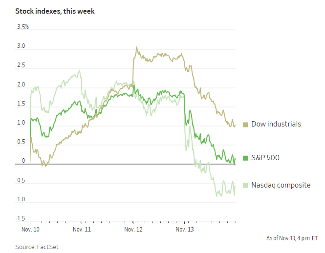 2025.11.14 本文字数:1002,阅读时长大约2分钟 作者 |第一财经 胡弋杰 美国股市周四大幅下跌,三大指数创一个多月以来最大单日跌幅,AI 龙头引领下挫。随着通胀担忧升 温、多位美联储官员对进一步宽松释放谨慎信号,市场对12月降息的押注明显降温。截至收盘,道琼斯 工业平均指数下跌797.6点,收于47457.22点,跌幅1.65%;标普500指数下跌1.66%,收于6737.49点;纳 斯达克综合指数重挫2.29%,报22870.36点。 七巨头全线承压,科技股领跌大盘。大型科技股集体承压,"七巨头"中,微软下跌1.54%,亚马逊下跌 2.71%,苹果下跌0.19%,特斯拉大跌6.64%,英伟达下跌3.58%,谷歌A下跌2.84%,只有Meta微涨 0.14% 资产管理公司Longbow Asset Management首席执行官杰克·多拉海德(Jake Dollarhide)表示:"市场在押 注降息,但美联储并没有给出明确信号。关税推升的通胀是否只是一次性扰动,是官员们犹豫的关键原 因。" 公司层面,思科上涨4.6%,公司上调全年营收与利润预测,受益于网络设备需求持续增长。迪士尼重 挫7.8%, ...