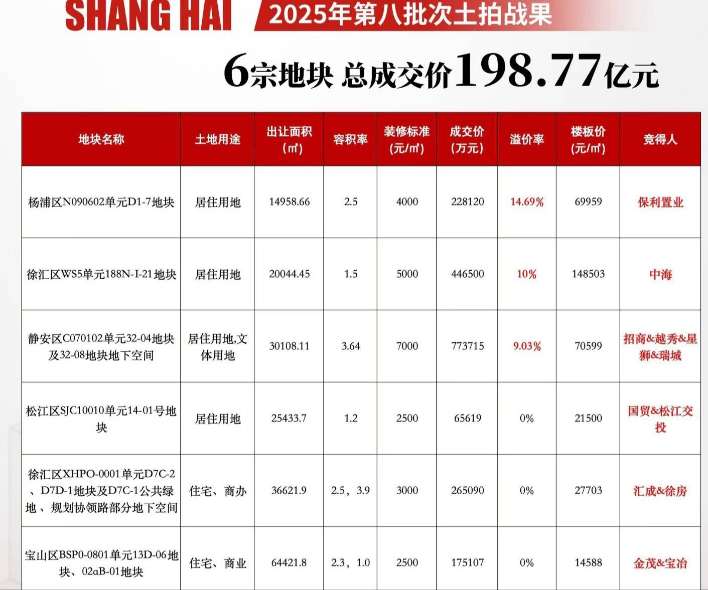 2025年10月20日上海八批次土拍,总共成交6幅地块,揽金199亿元,平均溢价率7.5%,整体呈现三大特点:第一,临近年末,土拍降温。作为新政之后的 首次土拍,虽然也有徐汇滨江与杨浦的溢价成交,但幅度最高不超过15%,没有出现预期中的火爆。这可以被解读为房企对后市的预期调低,也可能是房企 受制于去化而束缚了激进的动力。第二,房企区域,一一对应。本次土拍的其中三块地,被"不出所料"的房企摘得,结合他们之前在此周边的项目运行痕 迹,昭示品牌房企深耕区域的布局进一步加强:松江"是国贸的"、杨浦"是保利的"、宝山"是金茂的"。 做熟不做生,房企在主场心态、人脉关系、区域客研、产品逻辑等4个方面的摊低成本占得先手。第三,高价胆大,马太效应。徐汇滨江又刷新地王纪录, 中海icon以14.8万/㎡的楼板价追涨,未来保本销售价格肯定突破20万/㎡,受到绿城潮鸣东方的鼓舞,不再非得为一线江景才肯一掷千金。今天的徐汇滨 江,不止是卖江景,更卖日益稀缺的抢位入场券,购房者的心态进一步鼓舞房企,贵反而是一种安全感。综上,在北京大会开幕的第一天土拍,房企不可能 不考虑或对政策利好有所期待,但很明显,预期也在分化。 | 地块名称 | ...