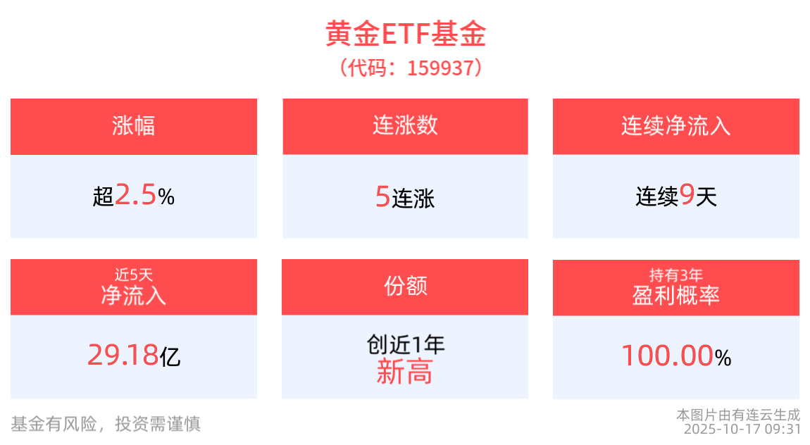 避险需求激增,金价再度改写历史,黄金ETF基金(159937)涨幅超2%,冲击5连涨