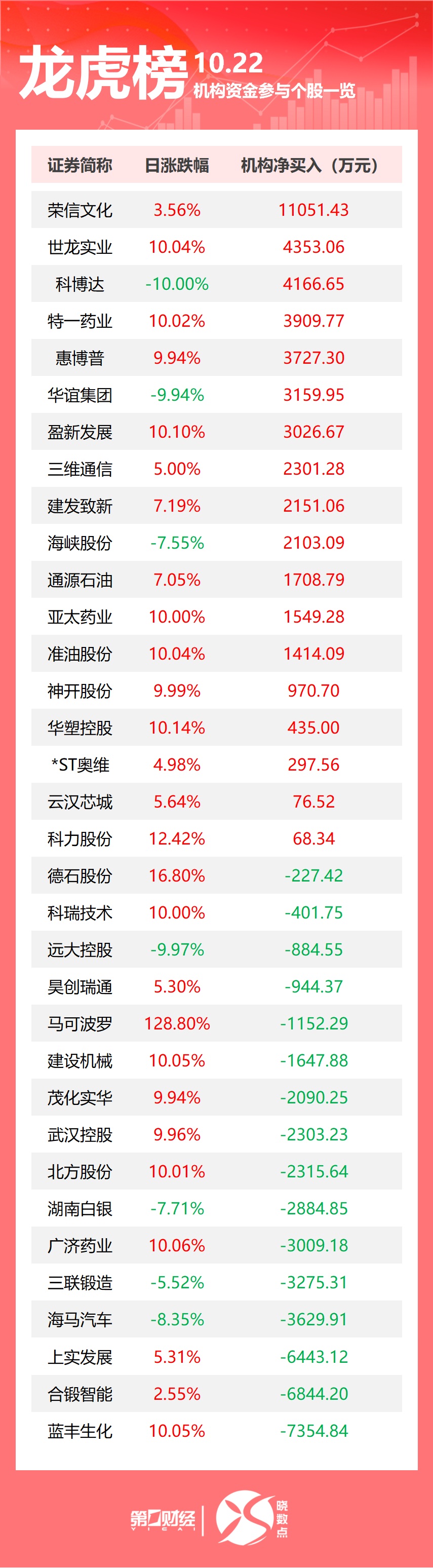 龙虎榜机构整体交易概况 - 10月22日共有34只个股出现机构身影 [1] - 其中18只股票呈现机构净买入,16只股票呈现机构净卖出 [1] 机构净买入重点个股 - 荣信文化为机构净买入首位,金额达1.11亿元,当日股价上涨3.56% [1][2] - 世龙实业机构净买入4353万元,股价涨停,涨幅10.04% [1][2] - 科博达获机构净买入4167万元,但当日股价跌停,跌幅10.00% [1][2] - 特一药业机构净买入3909.77万元,股价涨停,涨幅10.02% [2] - 惠博普机构净买入3727.30万元,股价上涨9.94% [2] 机构净卖出重点个股 - 蓝丰生化为机构净卖出首位,金额达7355万元,当日股价涨停,涨幅10.05% [1][4] - 合锻智能机构净卖出6844.20万元,股价上涨2.55% [1][4] - 上实发展机构净卖出6443.12万元,股价上涨5.31% [1][4] - 海马汽车机构净卖出3629.91万元,股价下跌8.35% [4] - 三联锻造机构净卖出3275.31万元,股价下跌5.52% [4]