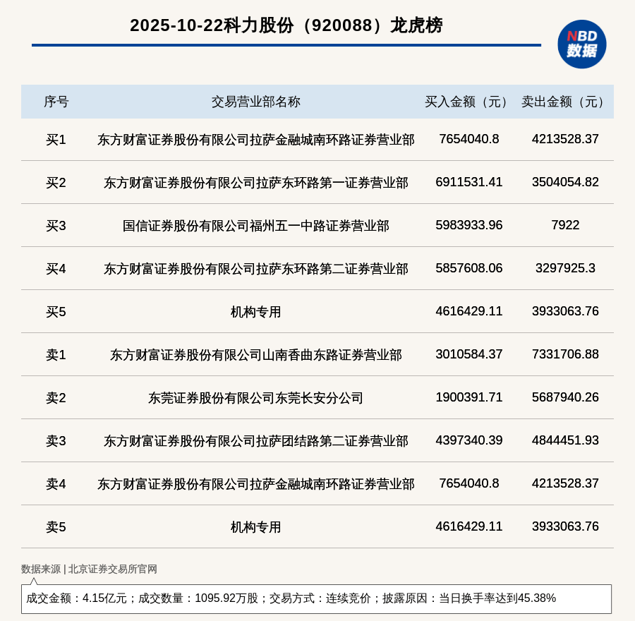 龙虎榜交易概况 - 科力股份于2025年10月22日因当日换手率达到45.38%登上龙虎榜,交易方式为连续竞价 [1] - 当日成交数量为1095.92万股,成交总金额为4.15亿元 [1] 买卖席位分析 - 买入金额排名第一的席位为东方财富证券拉萨金融城南环路营业部,买入765.4万元,该席位同时卖出421.35万元 [1][2] - 卖出金额排名第一的席位为东方财富证券山南香曲东路营业部,卖出733.17万元 [1][2] - 机构专用席位买入461.64万元,同时卖出393.31万元 [2] - 买入前五席位中包含三个东方财富证券拉萨地区的营业部 [2]