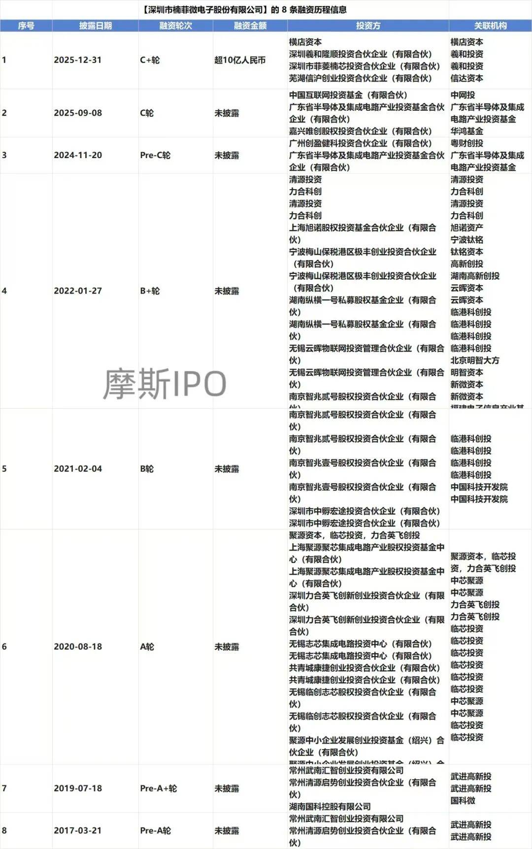 公司IPO进程 - 公司已正式启动A股IPO进程,于2026年2月10日向证监会提交了首次公开发行股票并上市的辅导备案报告 [1] - 辅导机构为中信建投证券,律师事务所为北京市中伦律师事务所,会计师事务所为容诚会计师事务所 [1][6][7] - 辅导工作已规划具体时间表,计划于2026年2月至6月期间完成全面尽职调查、集中学习培训及辅导验收等全部工作 [8] 公司基本情况 - 公司全称为深圳市楠菲微电子股份有限公司,成立于2015年11月13日,注册资本为41,407.4074万元 [5] - 公司注册地址位于广东省深圳市南山区,属于计算机、通信和其他电子设备制造业 [1][5] - 公司法定代表人与控股股东均为曾雨,其直接持有公司17.82%的股份,并通过直接、间接及一致行动关系合计控制公司48.92%的股份表决权 [1][5] 公司业务与产品 - 公司是一家专业从事数据中心互连、网络通信和智能物联网集成电路的研发、生产、销售和服务的企业 [1] - 公司产品覆盖高性能计算、路由、交换、物联网等领域,能够为运营商、企业和消费者提供综合解决方案和服务 [1] 公司融资历史与股东背景 - 公司在IPO前已完成多轮融资,投资方阵容强大,包括国家级及地方产业基金、知名市场化投资机构 [2][3] - 最近一轮融资为2025年12月31日完成的C+轮,融资金额超过10亿人民币,投资方包括横店资本、中国互联网投资基金等 [3] - 其他重要投资方包括广东省半导体及集成电路产业投资基金、中芯聚源、临芯投资、国科投资、清源投资、力合科创等 [2][3][4]