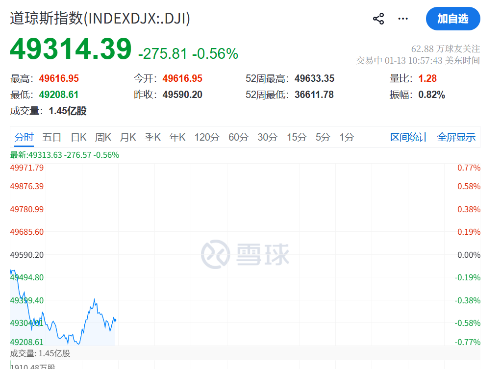 市场表现与直接诱因 - 美股三大指数在1月13日开盘后下跌,道指一度跌超300点,纳斯达克综合指数下跌0.22%至23681.71点 [2][4] - 市场避险情绪升温,同时原油价格大幅上涨,布伦特原油和纽约原油价格涨幅均扩大至3%左右 [2][8] - 市场异动的根源被指向美国前总统特朗普的相关言论与政策主张 [1] 对金融机构的具体影响 - 摩根大通股价下跌近3%,其投行业务手续费收入不及自身指引,承销与并购顾问业务收入均出现下滑 [5] - 摩根大通警告,特朗普提出的将信用卡利率设定10%上限的主张,对其业务构成“重大调整”风险,并将伤害公司及其客户 [5] - 摩根大通当日成交额为20.82亿美元,股价振幅达4.01% [7] 地缘政治与能源市场 - 特朗普排除了与伊朗进行谈判的可能性,并取消了与伊朗官员的所有会谈,措辞升级加剧了市场对供应中断的担忧 [8] - 对OPEC第四大产油国供应可能中断以及美国可能介入的担忧,推动油价攀升至两个月高位 [8] 货币政策与美联储独立性 - 特朗普持续抨击美联储主席鲍威尔,称其“无能”或“腐败”,并提及鲍威尔“把预算超支了数十亿美元” [9] - 此举标志着特朗普政府对美联储的攻击显著升级,再度引发外界对该机构独立性的担忧 [10] - 特朗普曾试探在鲍威尔主席任期于5月结束前将其解职的可能性,并正在权衡提名下一任主席人选 [10] 通胀数据与美联储政策前景 - 最新美国核心CPI同比上涨2.6%,与四年来的最低水平持平,显示价格压力正逐步缓和 [4][11] - 有分析师认为,核心CPI低于预期但不太可能改变美联储对1月会议的判断,美联储可以很从容地在1月维持利率不变 [7] - 圣路易斯联储行长穆萨勒姆表示,当前货币政策位置“合适”,进一步降息的必要性不大,并预计通胀将在今年逐步向2%的目标收敛 [11] - 投资者认为美联储在1月27日至28日的会议上再次降息的可能性很小,但仍预期2026年将有两次、每次25个基点的降息 [12]