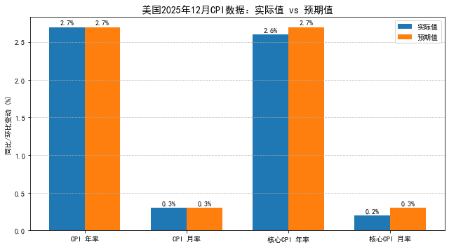 美国12月CPI数据概览 - 美国12月未季调CPI年率录得2.7%,与11月持平,符合市场预期 [1] - 剔除食品和能源的核心CPI同比增长2.6%,低于预估的2.7%;环比增长0.2%,低于预估的0.3% [4] - 数据增强了市场对通胀正在降温的信心,但当前水平仍高于美联储设定的2%年度目标 [1][7] 通胀结构分项表现 - **住房成本**:当月上涨0.4%,是月度涨幅的最大贡献项;该类别占CPI权重超过三分之一,同比上涨3.2% [10] - **食品价格**:12月整体上涨0.7%,但鸡蛋价格单月暴跌8.2%,较去年同期下降近21% [11] - **其他上涨领域**:娱乐(当月增长1.2%,为1993年有记录以来最大月度涨幅)、机票和医疗保健价格有所上升 [11] - **部分类别下降**:家居用品价格下降0.5%,部分归因于对进口商品加征关税的威胁暂缓 [11] 金融市场即时反应 - 美股期货全数翻红,国债收益率下降 [8] - 国际金银短线跳涨:现货黄金涨0.77%至4632.5美元/盎司;现货白银涨4.53%至88.958美元/盎司 [8] 市场对美联储政策预期 - 交易员加大押注美联储可能提前降息,4月降息的概率从数据发布前的38%升至约42% [11] - 尽管4月降息概率上升,市场仍认为6月降息是最可能的结果 [11] - 有观点认为,积极的就业数据、高企的通胀及政治因素可能使美联储至少在春季之前保持观望 [11]