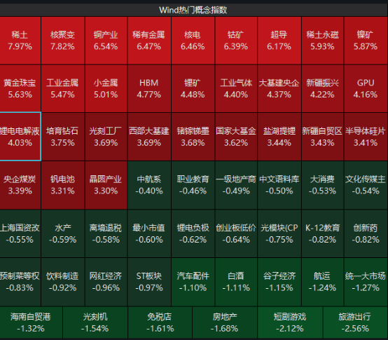 10月9日节后市场迎开门红,沪指突破3900点创十年新高,板块方面,稀土、核聚变、有色铜强势领 涨,其中,稀土大涨7.97%,铜产业大涨6.54%。 全球流动性改善,提振风险资产偏好。 利好二:供应受阻——自由港Grasberg铜矿事故 | | | | | Wind热门概念指数 | | | | | | --- | --- | --- | --- | --- | --- | --- | --- | --- | | 稀土 | 核聚变 | 铜产业 | 稀有金属 | 核电 | 钻矿 | 招导 | 稀土永磁 | 镇矿 | | 7.97% | 7.82% | 6.54% | 6.47% | 6.46% | 6.39% | 6.17% | 5.93% | 5.87% | | 黄金珠宝 | 工业会属 | 小金属 | HBM | 提矿 | | 工业气体 大基建央企 | 北昌康品 | GPU | | 5.63% | 5.47% | 5.01% | 4.77% | 4.48% | 4.40% | 4.37% | 4.22% | 4.16% | | 握电电解液 | 培育钻石 | 光刻工厂 | 西部大基建 | 储傢梯量 | 国家大量金 ...
