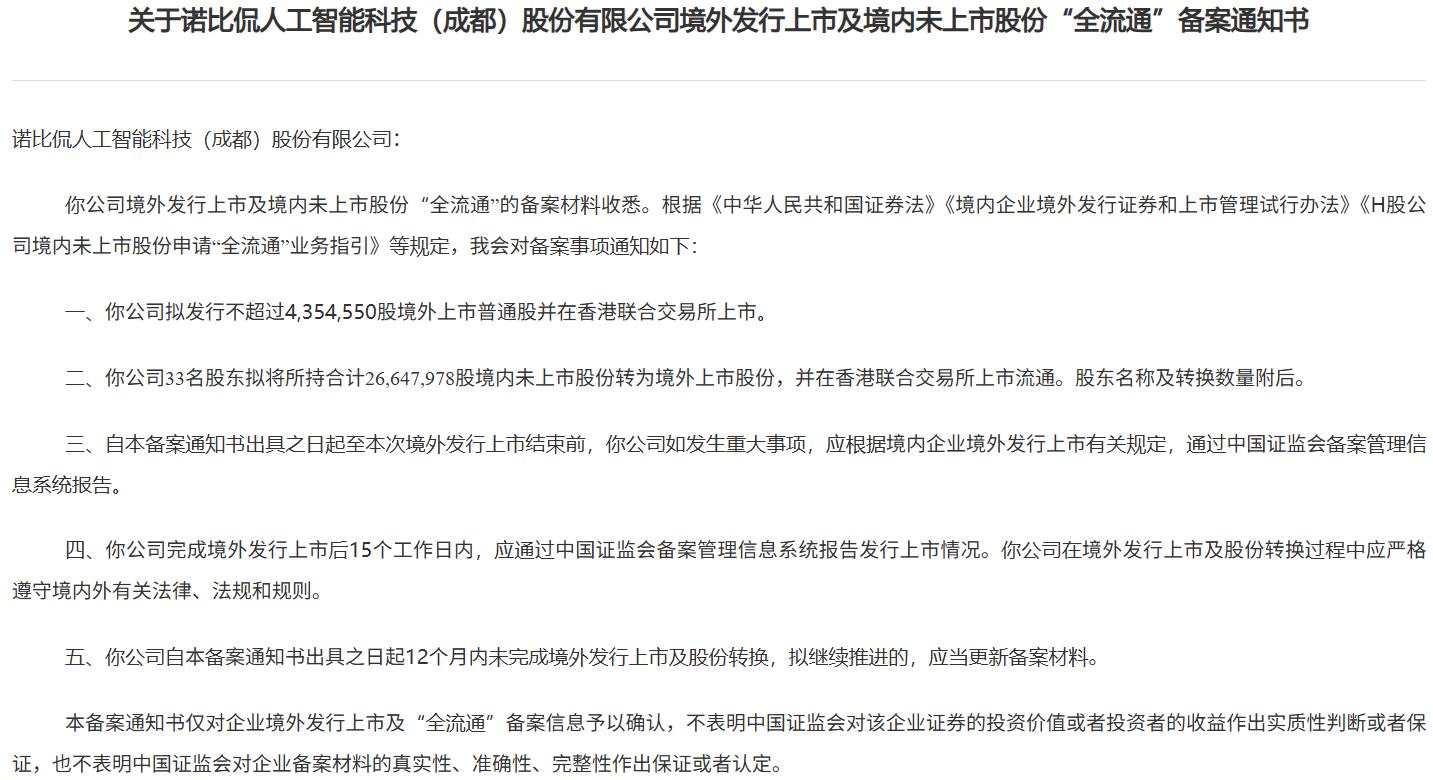 诺比侃港股IPO及境内未上市股份“全流通”获中国证监会备案