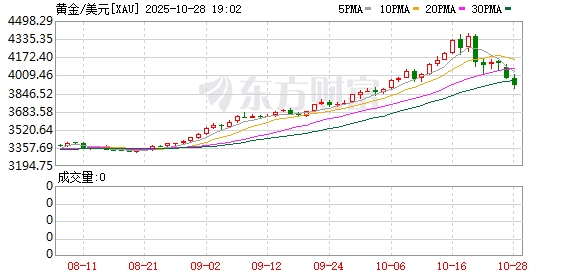 近日,国际黄金价格连续下跌。 10月28日,现货黄金一度大跌2.18%。截至发稿,现货黄金跌幅收窄至12.08%,报3898.9美元/盎司。较10月21日高点4381美元/盎司跌超10%。 截至发稿,COMEX期货黄金跌2.48%,报3920美元/盎司。 | W | COMEX黄金 | | | | | --- | --- | --- | --- | --- | | | GC.CMX | | | | | 3920.0 | 昨结 4019.7 | 总手 | | 11.96万 | | -99.7 | 3999.9 -2.48% 开盘 | 现手 | | 11 | | 最高价 | 4034.2 持 仓 35.67万 | 外 월 | | 5.59万 | | 最低价 | 3914.3 增 仓 4220 | 内 盘 | | 6.38万 | | 关于日本 | 五日 日K 周K | 月K | | 曲家 (0) | | 叠加 | | 均价:3981.3 | | | | 4125.1 | | 2.62% | | 3919.9 | | | | | | 3919.6 | | | | | 4:45 | 3920.3 | | | | | 4 ...