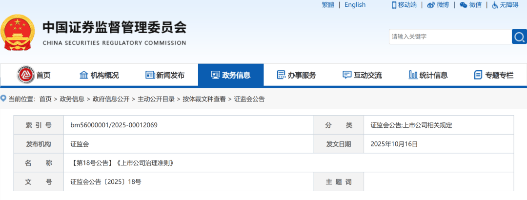 来源:季丰的会计师驿站 | | | | | 察體 English | [] 移动端 | る 微博 ● 微信 ▲ 无障碍 | | | --- | --- | --- | --- | --- | --- | --- | --- | | **** 中国证券监督管理委员会 CHINA SECURITIES REGULATORY COMMISSION | | | | | 请输入关键字 | | O | | (公)首页 血 机构概况 | 宣 新闻发布 | ■ 政务信息 | 邑. 办事服务 | | 同 互动交流 | 000 统计信息 | 国 专题专栏 | | ♀ 当前位置:首页 > 政务信息 > 政府信息公开 > 主动公开目录 > 按体裁文种查看 > 证监会公告 | | | | | | | | | 索 引 号 bm56000001/2025-00012069 | | | | स्ते 崇 | 证监会公告;上市公司相关规定 | | | | 发布机构 证监会 | | | | 发文日期 | 2025年10月16日 | | | | 文 号 | 证监会公告〔2025〕18号 | 主题词 | | --- | --- | --- | | ...