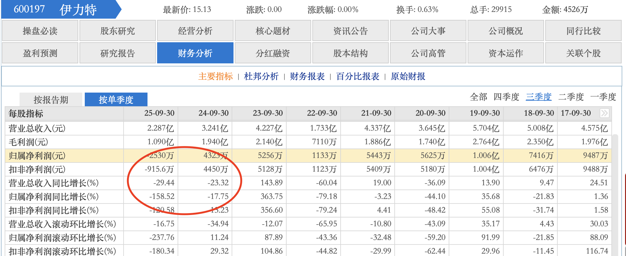 | 600197 伊力特 | | | 最新价:15.13 | 涨跌:0.00 | 涨跌幅:0 | | --- | --- | --- | --- | --- | --- | | 操盘必读 | 股东研究 | | 经营分析 | 核心题材 | 资 | | 盈利预测 | 研究报告 | | 财务分析 | 分红融资 | H | | | | | | 主要指标 杜邦分析 财务报表 百 | | | 按报告期 | 按单季度 | | | | | | 每股指标 | | 25-09-30 | 24-09-30 | 23-09-30 | 22-09-30 | | 营业总收入(元) | | 2.287 亿 | 3.241 7 | 4.227 7 | 1.733 7. | | 毛利润(元) | | 1.090亿 | 1.940 7 | 2.140 7 | 7110万 | | 归属净利润(元) | | 2530万 | 4325天 | 5256万 | 1133万 | | 扣非净利润(元) | | -915.6万 | 4450万 | 5128万 | 1123万 | | 营业总收入同比增长(%) | | -29.44 | -23.32 | 143. ...