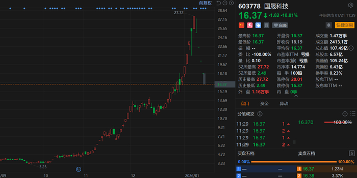 国晟科技(603778.SH)发预亏,预计2025年度归母净亏损3.25亿元至6.5亿元