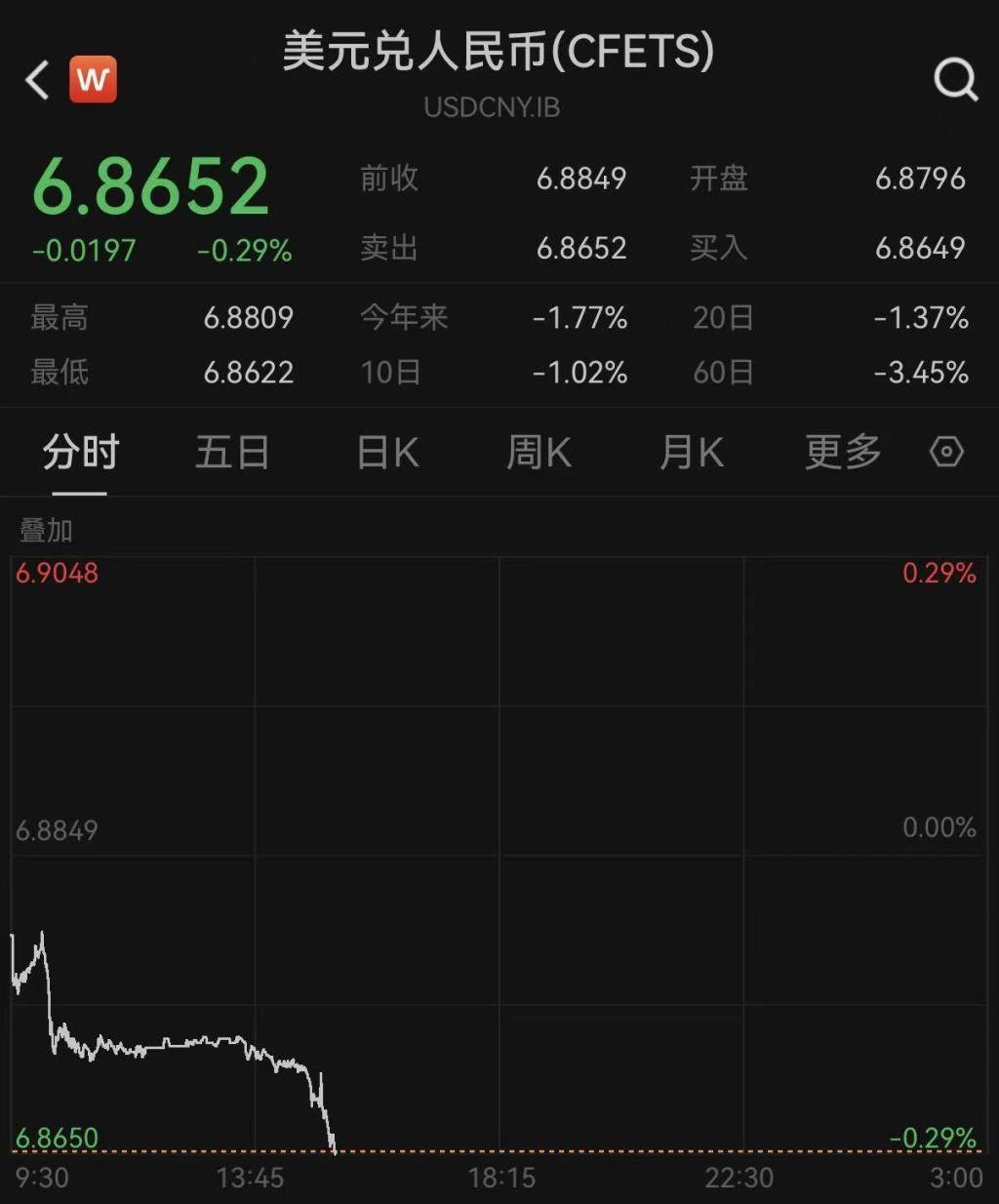 在岸、离岸人民币对美元汇率均升破6.87,创34个月新高