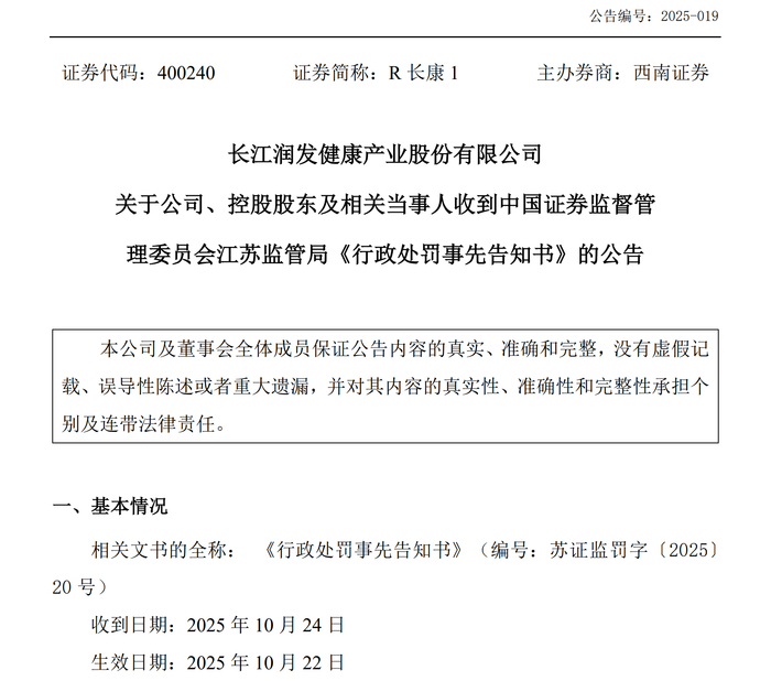 处罚概况 - 长江健康及其控股股东、相关当事人收到证监会江苏监管局《行政处罚事先告知书》[1] - 因涉嫌信息披露违法违规,公司及5名责任人共计被罚款5330万元[1] - 公司原董事长郁霞秋、黄忠和被采取终身证券市场禁入措施,财务总监张义被采取3年证券市场禁入措施[1] 违规行为 - 公司涉嫌未及时披露关联方非经营性资金占用[1] - 公司定期报告存在重大遗漏[1] 公司背景与市场影响 - 公司注册地位于苏州,曾用证券简称为“长江健康”和“ST长康”[1] - 公司股票曾出现40个跌停[1] - 因连续二十个交易日收盘价均低于1元,公司于2024年8月15日退市摘牌[1] - 此次处罚发生在公司退市一年多后,彰显监管部门对资本市场违法违规行为的“零容忍”态度[1]