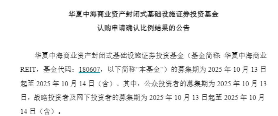 公募REITs市场认购热度 - 两只公募REITs产品合计吸引认购资金超2000亿元,再现千亿元资金抢筹现象 [1] - 华夏中海商业REIT公众和网下投资者有效认购申请确认比例分别为0.2763%和0.3120%,对应认购倍数高达361.9倍和320.5倍 [1] - 中信建投沈阳国际软件园REIT也吸引认购资金超444亿元 [1][6] 华夏中海商业REIT发行详情 - 该基金比例配售前的总募集规模达1593.3亿元,是其拟募集规模15.843亿元的100.5倍 [4] - 网下发售部分认购倍数创历史新高,达374.72倍,比例配售前募集规模约为1066.21亿元 [4] - 公众发售部分认购倍数为361.9倍,比例配售前募集规模约为516亿元,发售当日即提前结束募集 [4] - 战略配售部分认购规模为11.09亿元 [4] - 首发底层资产为佛山映月湖环宇城,标志着公司实现了全流程资本闭环 [5] 中信建投沈阳国际软件园REIT发行详情 - 该基金比例配售前的有效认购金额约为444.34亿元 [8] - 公众投资者配售比例为0.40408970%,网下投资者有效认购申请确认比例为1.20029722% [8] - 战略投资者配售比例为100%,占基金发售份额总数的70.00% [8] - 首发基础设施项目为沈阳市浑南区的13栋产业楼宇,是东北地区首单成功发行的公募REITs项目 [8] 行业意义与资产价值 - 消费REITs的长期投资价值和资产配置价值持续得到投资者认可 [5] - 项目的成功发行为区域盘活存量资产、激活数字经济活力树立了全新标杆 [8]