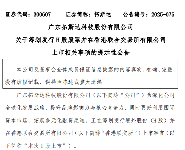 来源:市场资讯 (来源:维科网机器人) 近日,"广东机器人第一股"拓斯达发布公告称,正在筹划发行境外股份(H股)并在香港联合交易所有限公司上市事宜。这 一举措旨在深化其全球化发展战略,提升品牌影响力与核心竞争力,同时更好利用国际资本市场,拓展多元化融资渠道。 公告称,拓斯达正与相关中介机构就本次H股上市的具体推进工作进行商讨,相关细节尚未确定,本次H股上市不会导致公 司控股股东和实际控制人发生变化。 国内安防机器人先驱暴雷 作为一家深耕智能制造近20年的领军企业,拓斯达依托多年技术沉淀,不断打磨以工业机器人、注塑机、数控机床为核心的 智能装备,打造以核心技术驱动的智能硬件平台,实现了从核心零部件、高端装备到智能工厂解决方案的全栈闭环。 2025前三季度,拓斯达实现营业收入16.88亿元,同比下滑24.49%;归母净利润4933.65万元,同比增长446.75%;扣非归母净 利润3580.67万元,同比增长3969.23%。其中,工业机器人及自动化应用系统业务实现营业收入5.45亿元,同比增长2.34%, 毛利率36.67%,同比保持稳定 作为广东省战略性新兴产业集群智能机器人领域"链主",拓斯达在工业机器人领 ...