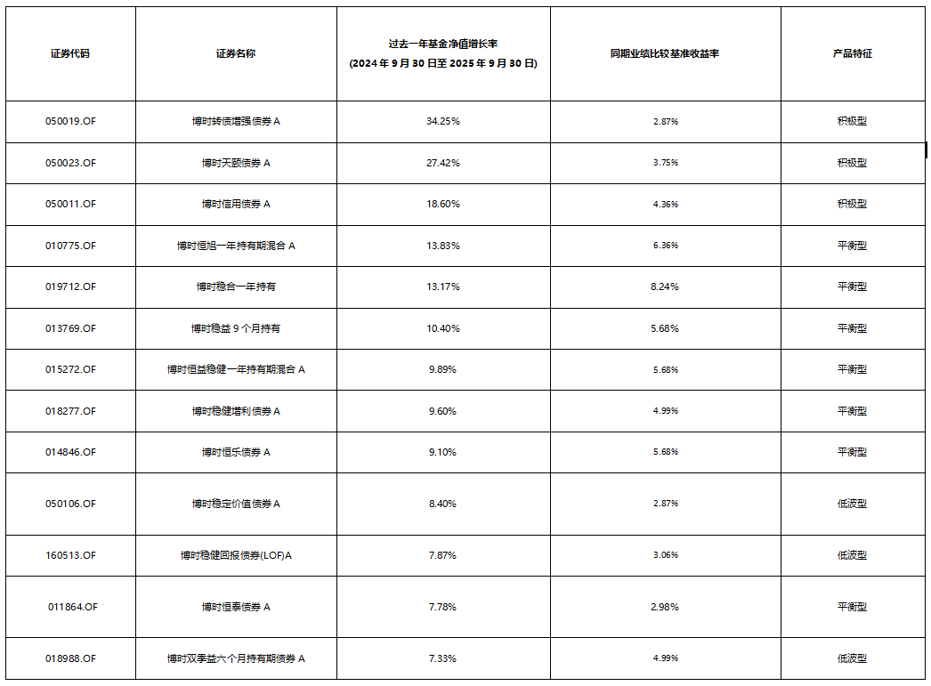 回溯三季度,A股以AI、自主可控为引领的科技板块强势崛起,成为投资主线;而债市在"股债跷跷板"效应、"反内卷"政策落地及季末资金面紧张等 多重因素叠加下持续调整。面对权益市场轮动加快、低波资产收益空间收窄的复杂环境,投资者纷纷转向"固收+"寻求风险收益平衡。博时基金固收 +矩阵凭借多元资产配置策略,在三季度实现业绩与规模双增长,充分展现"攻守兼备"的配置智慧。 数据来源:基金定期业绩报告,截至2025.09.30。过去一年指2024年9月30日至2025年9月30日。基金历史表现不预示收益。 固收大厂做"+"法,博时固收+全谱系"各展所长" 三季度博时固收+的爆发式增长,并非偶然,而是源于其多年深耕固收领域的专业沉淀,以及覆盖全风险谱系的产品矩阵布局。"固收+"的核心优势 在于以债券资产为底仓以争取降低波动,同时通过配置股票、可转债等含权资产力争增厚收益,博时基金根据含权资产配置比例的差异,构建了涵 盖积极型、平衡型、低波型的完整固收+产品矩阵,精准匹配不同投资者的风险收益偏好。 积极型:高含权布局,拥抱成长红利 以博时转债增强债券A为例,该基金由高晖、过钧管理,在三季度的运作中,管理团队维持中性转债仓位,同 ...