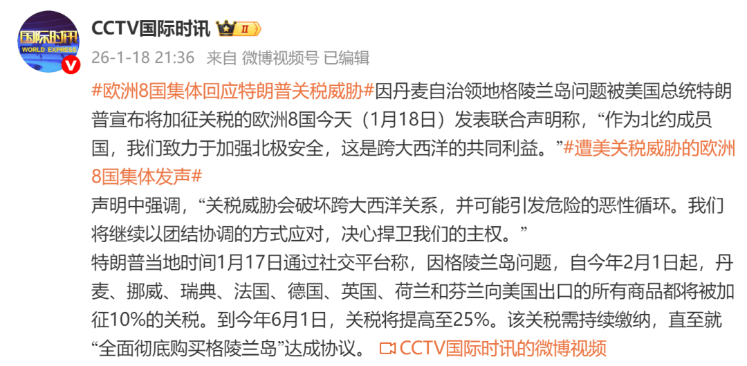 美国对欧洲八国加征关税事件 - 美国总统特朗普宣布因格陵兰岛问题对丹麦、挪威、瑞典、法国、德国、英国、荷兰和芬兰八国输美商品加征关税 自2月1日起加征10%关税 6月1日起提高至25% 直至就“全面彻底购买格陵兰岛”达成协议 [1][9] - 特朗普自称“关税之王” 并曾表示可能通过加征关税向欧洲国家施压以解决格陵兰岛问题 称该岛对美国国家安全至关重要 [6][9] - 美国最高法院可能对特朗普单方面征收关税的合法性做出裁决 这些关税已通过对外国进口商品征税筹集了数千亿美元 [9] 欧洲国家的回应与立场 - 受影响的欧洲八国发表联合声明 称关税威胁会破坏跨大西洋关系并可能引发危险的恶性循环 强调将团结协调应对并捍卫主权 [1] - 荷兰外交大臣批评美国行为是“不正当”的“勒索” 表示将在欧盟框架内推动美国撤销决定 若不成功则不排除欧盟采取反制措施 [3] - 法国总统马克龙表示将在必要时请求启动欧盟反胁迫工具以应对美国关税威胁 这是法国首个官方回应 [10] - 多名欧洲议会议员表示 鉴于美方威胁 去年7月达成的欧美贸易协议将无法获得通过 并呼吁使用反胁迫工具回应 [9] 欧美贸易协议与潜在影响 - 此前达成的欧美贸易协议中 欧盟需取消对美国产工业品关税并为美海产品和农产品提供优惠市场准入 以换取美国对大多数欧盟输美商品征收15%的关税 [10] - 欧盟反胁迫工具于2023年通过 旨在应对第三国通过贸易措施试图影响欧盟决策的行为 被认为是欧盟最强硬的贸易应对手段之一 [10]