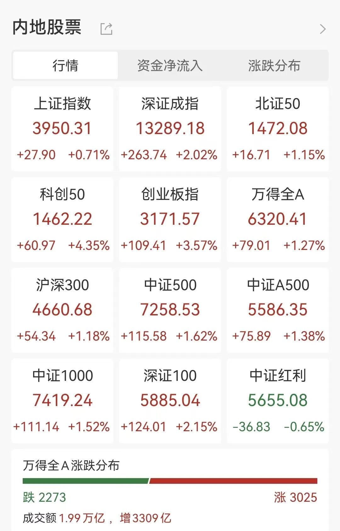 市场整体表现 - 上证指数报3950.31点,上涨0.71%,创下近十年最高收盘纪录 [2] - 创业板指收盘报3126.05点,单日上涨3.57%,今年累计涨幅近50% [2] - 全市场2943只个股上涨,50只个股涨停,A股全日成交金额突破1.9万亿元 [2] 板块与行业动态 - 科技股成为市场主角,中证信息指数本周大涨7.64%,通信设备、人工智能、半导体等板块涨幅居前 [2] - 半导体产业链领涨,存储芯片龙头普冉股份、香农芯创、江波龙集体创历史新高 [2] - 创业板成分股集中于电力设备、电子、通信和计算机等新兴产业,具有高科技含量和良好成长性 [3] 寒武纪个股表现 - 国产AI芯片龙头寒武纪股价飙升9.01%,收盘价1525元/股,超越贵州茅台重夺A股“第一高价股”称号 [2][4] - 寒武纪今年以来股价涨幅达112.46%,近三年累计涨幅超过28倍,总市值突破6430亿元 [4] - 高盛等机构给出寒武纪1835元的目标价,部分机构看到3934元的长期空间 [4] 政策与行业前景 - A股科技板块市值占比超过1/4,已高于银行、非银金融、房地产行业市值合计占比 [5] - 市值前50名公司中科技企业从“十三五”末的18家提升至当前的24家 [5] - 机构观点认为2025年国产算力将崛起,需求端大厂资本开支高增,供给端先进制程突破,一条国产算力产业链正在成型 [5]