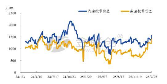 国际原油市场表现 - 2026年以来,国际原油价格在**地缘风险升温、供应端收紧、需求端韧性增长**三大因素作用下,呈现**整体上行、小幅回调**特征,布伦特原油站稳**70美元/桶**附近,WTI原油在**66美元/桶**附近波动,春节假期期间累计涨幅近**6%** [1] - 后市国际原油价格大概率在**地缘政治**影响下保持震荡格局,其中**美伊核谈结果**将直接引导油价走势 [3] 国内成品油零售价格调整 - 受国际油价上涨影响,春节假期后国内成品油零售价迎来上调,2026年以来调整呈现**三涨一搁浅**格局 [1] - 据金联创统计,三次上调累计幅度分别为:**汽油465元/吨,柴油450元/吨** [1] - 新一轮调价周期,**上调概率依旧较大**,消息面指引谨慎向好 [3] 国内成品油批发市场行情 - 节后原油收盘连续两日下跌,消息面支撑不足,**批发端行情趋弱运行**,国内批零价差走势再创新高 [1] - 截至2月25日,国内主营**92汽油均价为7841元/吨**,较年初上涨**113元/吨**,**0柴油均价为6436元/吨**,较年初走跌**215元/吨** [1] - 汽柴批发行情走势分化明显:**汽油价格震荡上涨**,**柴油价格下跌为主** [3] 汽油市场供需与价格分析 - 汽油需求受**春节假期**带动表现尚可,加之原油走势偏强,批发价格走势较为坚挺 [3] - **新能源冲击持续发力**,汽油终端消费量继续萎缩,抑制了汽油价格上推幅度 [3] - 春节假期结束,**汽油终端消耗量下降明显**,短期内价格下行压力较大,汽油批零价差或继续扩大 [3] 柴油市场供需与价格分析 - 柴油需求进入冬季传统淡季,**户外工程、基建**等主力需求减弱,节前终端囤货意愿偏低,批发行情震荡下行 [3] - 柴油批零价差涨幅较大,触及**2024年5月以来的高位** [1] - 元宵假期前柴油需求复苏缓慢,支撑仍显不足,但当前价格处于低位,成本面支撑趋强,预计**柴油价格下跌空间有限**,短期内批零价差窄幅波动为主 [3] 国内批零价差表现 - 国内批零价差走势再创新高,其中**汽油批零价差触及2025年4月以来的高位**,**柴油批零价差触及2024年5月以来的高位** [1] - 由于柴油价格下跌为主,其**批零价差涨幅较大** [3]