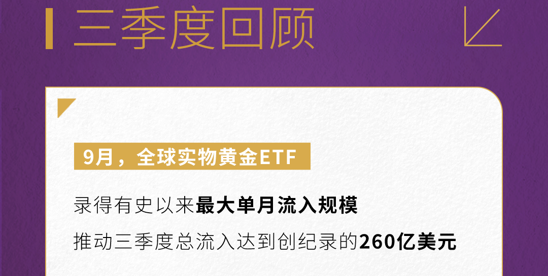 智通财经APP获悉,世界黄金协会10月21日发文称,9月全球实物黄金ETF录得有史以来最大单月流入规模,推动三季度总流入达到创纪录的260亿美元。 截至三季度末,全球黄金ETF资产管理总规模(AUM)增至4,720美元,再创历史新高。其中,北美与欧洲基金成为主导力量,9月分别录得流入约106亿美 元和约44亿美元。 总持仓环比增长6% ® @ 0 3 a 000 CV 室( 较2020年11月 第一周3,929吨的历史峰值仅低2% 北美与欧洲地区基金 成为主导力量 北美地区 9月 流入约 欧洲地区 9月 流入约 已连续五个月保持流入态势 成为该地区有史以来第三强劲的黄金ETF单 月流入表现 英国、瑞士和德国市场基金再度领跑 英国黄金ETF需求的强劲增长 是该地区黄金ETF需求的主要驱动力 尽管欧洲央行和英国央行本月均维持利率不变 但通胀上行令当地实际利率下降 叠加上升的政策不确定性 增强了黄金ETF的吸引力 el 亿美元 连续第四个月实现净流入 9月和整个季度的需求走强 驱动因素主要包括: ● 贸易、政策及地缘政治风险持续存在 美元疲软,叠加政府停摆担忧 ● ● 美联储9月降息25个基点 市场预计年内或将再次 ...
