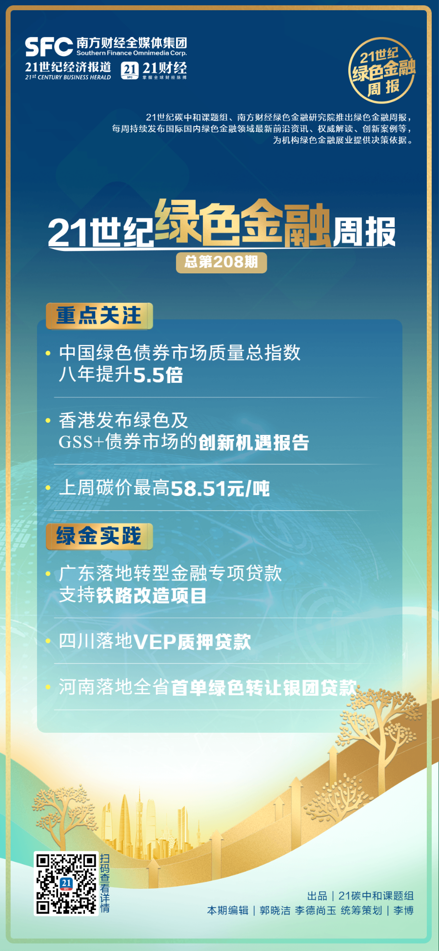 中国绿色债券市场质量总指数 - 中国绿色债券市场质量总指数从2016年的基准值100升至2024年的548.4,八年提升5.5倍,年复合增长率达23.5% [4] - 政策支持、市场运行、信息披露和国际合作对指数增长的贡献率分别为40.6%、31.6%、16.4%和11.4% [4] - 绿色债券发行规模从2016年的2018亿元增长至2024年的6833亿元,年均增长16.5%;市场存续规模从2039亿元增长至21621亿元,年均增长34.3%;发行机构数量从35家增长至249家,年均增长27.8% [4] 香港GSS+债券市场创新机遇 - 报告提出通过政策补贴、数字技术融合、分类标准创新及鼓励多元发行主体参与等举措,以增强市场流动性、促进产品多样化并推动标准统一 [5] - 报告旨在发挥香港“超级联系人”的角色,为区域绿色项目提供高效融资支持,促进跨境资本有序流动 [5] - 该报告是粤港绿色金融协同研究的成果,能推动香港助力大湾区绿色项目跨境融资与资本有序流动 [6] 全国碳市场交易情况 - 上周全国碳市场综合价格最高价为58.51元/吨,最低价为51.54元/吨,收盘价较前一周五上涨11.22% [7] - 上周全国碳排放配额总成交量为9,235,657吨,总成交额为463,140,708.27元 [8] - 2025年1月1日至11月7日,全国碳市场碳排放配额累计成交量148,896,989吨,累计成交额9,248,937,296.08元;截至11月7日,累计成交量779,165,653吨,累计成交额52,281,664,399.59元 [9][10] 广东转型金融专项贷款实践 - 广发银行阳江分行为某铁路公司发放1980万元转型金融专项贷款(授信总额4920万元),支持淘汰老旧内燃机车并投用低能耗、高可靠性机车 [11] - 该项目纳入国家发改委专项再贷款名单,并获得2025年超长期特别国债资金支持,实施后预计每年可节能约1200吨标煤、减排3000吨二氧化碳,运输效率提升30% [11] 四川生态产品价值(VEP)质押贷款实践 - 兴业银行成都分行为西昌海河文旅投发放1亿元VEP质押贷款,以邛海湿地景区生态价值为质押物,实现四川省首单生态产品价值质押融资 [12] - 项目引入气候调节、水源涵养、固碳释氧等指标的生态价值核算体系,对湿地核心生态功能进行量化评估,测算总价值超4亿元 [12] 河南绿色转让银团贷款实践 - 中原银行落地河南省首单金额3亿元的绿色转让银团贷款,用于河南空港数字城市绿色数据中心建设 [13] - 项目严格执行绿色建筑标准,配套高效液冷系统、AI能效优化等低碳技术,融资结构采用“转让银团+绿色属性识别”模式,通过贷款份额转让吸引更多银行协同投入 [13]