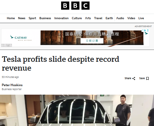 利润大幅下滑超三成,特斯拉盘后下挫超3%