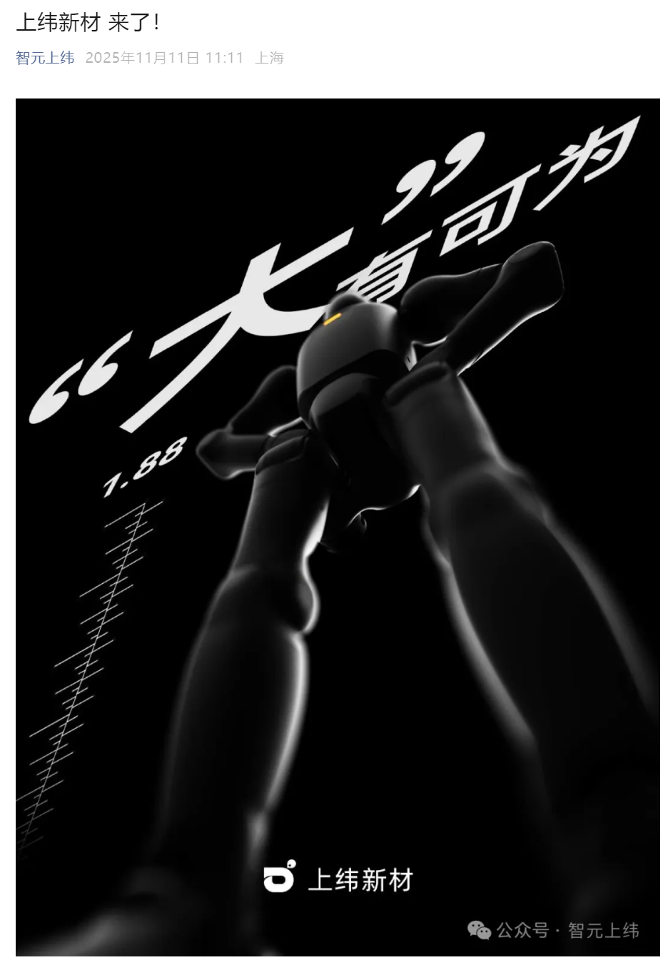 每经AI快讯,11月11日,名称为"智元上纬"的公众号已经上线,账号主体为"上纬新材料科技股份有限公司",并发布了机器人概念产 品预热海报。 上纬新材 来了 ! 智元上纬 2025年11月11日 11:11 上海 1. プ 上纬新材 2 公众号·智元上纬 ...