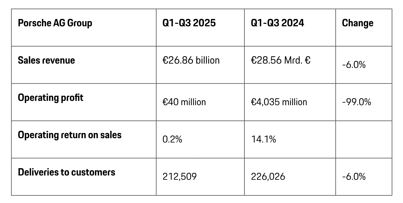 保时捷前三季度核心财报数据 图片来源:保时捷官网 截至10月24日收盘,保时捷股价为34.81欧元,较其2022年上市时的发行价82.5欧元下滑了近58%,处于腰斩态势。 该公司利润断崖式下跌源于多重压力叠加。财报明确提及五大核心因素,一是与产品战略调整相关的特殊费用;二是中国市场环境充满挑战,尤其是豪华车 赛道;三是与电池活动相关的"一次性"费用支出;四是组织变革费用;五是美国进口关税增加的支出。 智通财经记者 | 宋佳楠 近日,保时捷发布的2025年前三季度财报显示,其销售收入为268.6亿欧元,同比下降6%;营业利润为4000万欧元,去年同期为40.35亿欧元,同比暴跌 99%;本年累计营业利润率为0.2%,较去年同期的14.1%大幅下滑。 | Porsche AG Group | Q1-Q3 2025 | Q1-Q3 2024 | | --- | --- | --- | | Sales revenue | €26.86 billion | €28.56 Mrd. € | | Operating profit | €40 million | €4,035 million | | Operating re ...
