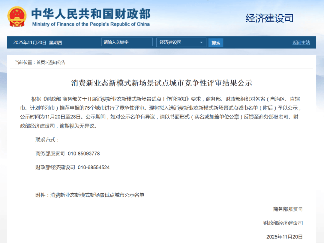 政策背景与目标 - 财政部与商务部于9月底发布通知,旨在通过遴选约50个城市开展消费新业态新模式新场景试点工作,以增加优质消费供给、释放多样化差异化消费潜力并全方位扩大国内需求 [1] - 试点政策主要向人口基数大、带动作用强、发展潜力好的超大特大城市倾斜 [1] - 政策实施期为两年 [1] 试点城市遴选结果 - 全国共有75个城市参与申报,经过竞争性评审,最终有50个城市入选,包括合肥、北京、上海、杭州等 [1] - 竞争性评审结果于11月20日进行公示,公示时间为11月20日至28日 [1] 政策支持与探索方向 - 入选城市将获得中央财政资金支持 [1] - 资金将用于围绕健全首发经济服务体系、创新多元化服务消费场景、促进优质消费资源与知名IP跨界联名等重点方向开展探索 [1]