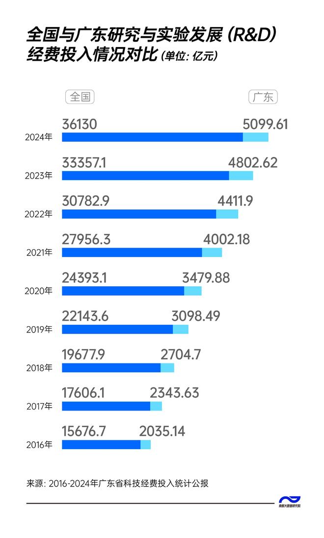 "信心有数"栏目 南方都市报、南都大数据研究院"信心有数"栏目,用数据记录广东实现现代化的奋进之路,用数据描绘 万马奔腾共创美好的活力之路,用数据书写每一个你我昂扬向上的信心之路。 千里之行,系于你我;心中有数,广东可期。 广东"十五五"规划将"科技自立自强水平大幅提高"列为八大主要目标之一,而持续加大创新研发投入是 实现这一目标的关键支撑。 最新发布的《2024年广东省科技经费投入统计公报》(以下简称《公报》)显示,广东研究与试验发展 (R&D)经费已连续9年位居全国首位,投入强度(与GDP之比)高于全国平均水平,也超过欧盟及经 合组织国家(OECD)平均水平,凸显出其在科技创新上的领先优势。 广东R&D经费实现"九连冠" R&D经费是衡量一个国家和地区科技投入力度的核心指标,直接反映科创创新力与高质量发展潜力。 《公报》显示,2024年,广东R&D经费高达5099.61亿元,同比增长6.2%,投入规模连续9年位居全国首 位。横向对比来看,广东领先优势显著,较江苏(4597.5亿元)高出约500亿元,较北京(3278.4亿元) 高出约1800亿元。纵向追溯,广东R&D经费从2016年的2035.14亿元增长 ...