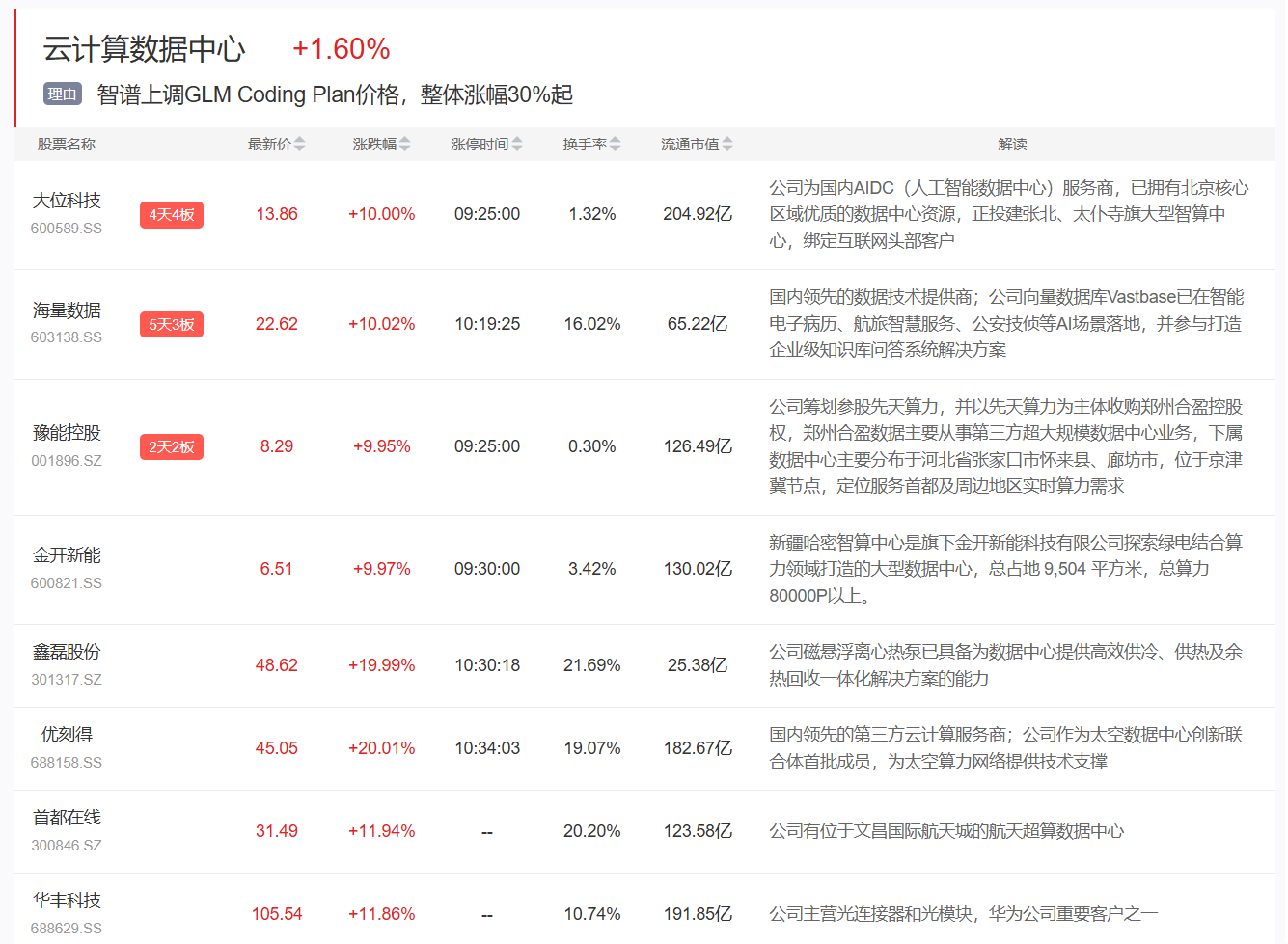 文章核心观点 - 2月12日,算力产业链(包括CPO、液冷、云计算等)多板块集体大涨,多只相关个股涨停或大幅上涨 [1] - 市场行情受到政策支持、AI模型能力升级与涨价、海外龙头财报超预期、以及大厂持续投入等多重积极事件的共同驱动 [1][2][3][4] - 机构认为,AI应用落地与技术迭代驱动算力需求持续高增,产业链价值重估,云计算、液冷等关键环节将充分受益 [4][5] 市场行情表现 - 2月12日,算力产业链如CPO、液冷、云计算等多板块集体大涨 [1] - 大元泵业、川润股份、博杰股份、优刻得(20CM)等集体涨停,申菱环境、朗进科技、依米康、首都在线、天孚通信、青云科技、英维克等集体大涨 [1] - 云计算数据中心板块指数上涨+1.60% [2] - 智谱AI于2月12日上调GLM Coding Plan价格,整体涨幅30%起 [2][3] 领涨个股详情 - **大位科技 (600589.SS)**:4天4板,最新价13.86元,涨幅+10.00%,流通市值204.92亿元,公司为国内AIDC区域优质的数据中心资源,正投建张北数据中心,绑定互联网头部客户 [2] - **海量数据 (603138.SS)**:5天3板,最新价22.62元,涨幅+10.02%,流通市值65.22亿元,公司为国内领先的数据技术提供商,向量数据库应用于企业级知识库问答系统解决方案 [2] - **豫能控股 (001896.SZ)**:2天2板,最新价8.29元,涨幅+9.95%,流通市值126.49亿元,公司筹划参股先天算力,并以先天算力为主体,在河北怀来投建数据中心 [2] - **金开新能 (600821.SS)**:最新价6.51元,涨幅+9.97%,流通市值130.02亿元,旗下新疆哈密智算中心是公司在算力领域打造的大型数据中心,总占地9万平方米,规划算力80000P以上 [2] - **慈磊股份 (301317.SZ)**:最新价48.62元,涨幅+19.99%,流通市值25.38亿元,公司磁悬浮离心热泵已具备为数据中心提供热回收一体化解决方案的能力 [2] - **优刻得 (688158.SS)**:最新价45.05元,涨幅+20.01%,流通市值182.67亿元,公司为国内领先的第三方云计算服务商,是太空算力网络联合体首批成员 [2] - **首都在线 (300846.SZ)**:最新价31.49元,涨幅+11.94%,流通市值123.58亿元,公司有位于文昌国际航天城的航天超算中心 [2] - **华丰科技 (688629.SS)**:最新价105.54元,涨幅+11.86%,流通市值191.85亿元,公司主营光连接器和光模块,是华为公司供应商 [2] 驱动事件与政策 - 2月11日,国务院以深化拓展“人工智能+”、全方位赋能千行百业为主题,进行第十八次专题学习 [3] - 国务院国资委提出,中央企业要强化投资牵引,积极扩大算力有效投资,推进“算力+电力”协同发展 [3] - 2月11日,智谱发布新一代旗舰模型GLM-5,在Coding与Agent能力上取得开源SOTA表现,在真实编程场景的使用体感逼近Claude Opus 4.5 [3] - 当地时间2月11日,受2025财年第四季度财报超预期以及强劲的业绩指引驱动,美股液冷龙头维谛技术高开高走大涨超24%,再创历史新高 [3] - 字节跳动豆包大模型2.0初定2月14日正式发布 [3] 行业趋势与机构解读 - 春节期间大厂总计投入45亿元争夺AI入口,算力需求将持续高增 [4] - 算力需求爆发源于AI应用落地与技术迭代双重驱动,产业链从上游芯片到下游服务全面受益 [4] - AI Agent时代对基础设施的弹性调度、状态保持、知识记忆等要求持续提升,推动云计算厂商加大算力投入 [4] - 超级AI App单用户指令算力消耗远超传统ChatBot,进一步放大需求缺口 [4] - AI产业链通胀传导持续,从存储、CPU逐步蔓延至云计算服务,AWS开启涨价打破行业二十年价格下行惯例,带动产业链价值重估 [5] - 全球云计算市场保持高增长,2024年规模达6929亿美元(同比+20.3%),中国市场规模8288亿元(同比+34.4%),预计2030年全球接近2万亿美元、中国突破3万亿元 [5] - 国内厂商将充分受益于算力建设浪潮,阿里云通过弹性沙箱调度、扩容机制等保障AI Agent高效运行,腾讯云2025年大模型产品收入两年增长50倍,AI及SaaS产品订单翻倍 [5] - 海内外资本开支持续高增推动AIDC全产业链放量,液冷作为关键增量环节,技术路线向冷板、微通道、浸没式多元化发展 [5] - 微通道液冷效率比传统冷板提升40%-60%,正从实验室走向规模化应用 [5] - 800VHVDC供电方案因高效率、低成本优势,渗透率将在2026-2027年快速提升,国内厂商预计2026年下半年实现首批发货 [5]