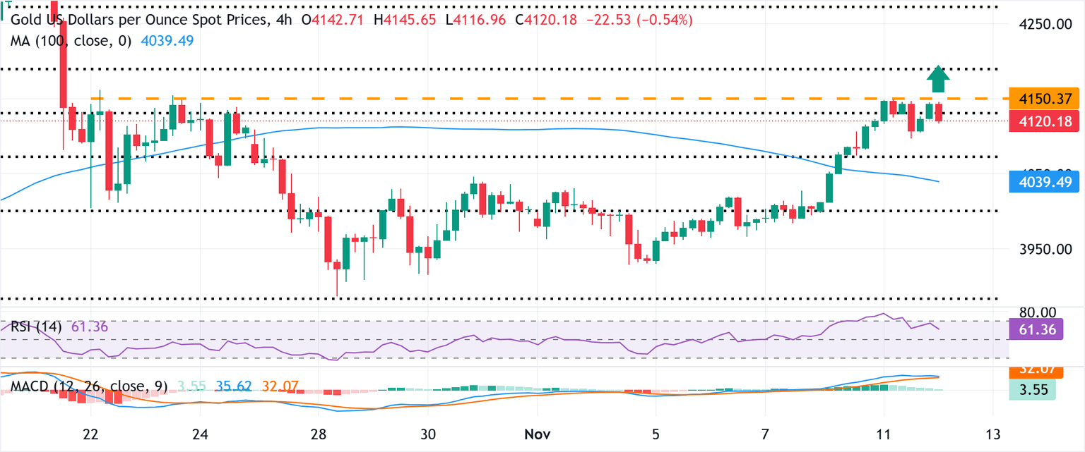 黄金价格驱动因素 - 金价自4100美元下方反弹,逼近三周高点,主要受美联储鸽派预期及对美国经济动能减弱的担忧影响 [1] - 美元持续承压,难以吸引实质性买盘,为无收益的黄金提供关键支撑 [1] - 美国政府重启的积极进展支撑风险偏好情绪,可能抑制对避险黄金的激进看涨押注 [1] 宏观经济背景 - 美国政府长期停摆可能已使季度GDP增速削减约1.5%-2.0% [1] - 10月美国就业岗位减少9100个,政府部门裁员22200人,上月失业率预估小幅攀升,表明劳动力市场持续恶化 [2] - 近期美国就业与消费者信心指标均弱于预期,强化了市场对美联储鸽派政策的预期 [1][2] 市场预期与技术分析 - 交易员认为美联储下月降息概率显著,周二拖累美元跌至近两周低点 [1][2] - 金价在4100美元关键支撑位下方再度显现韧性 [3] - 若买盘能持续突破4150-4155美元区间,可能推动金价重返4200美元关口,突破61.8%斐波那契回撤位将为短期内进一步升值铺平道路 [5] - 4100-4095美元区域构成即时支撑,其下方4075美元区域(38.2%斐波那契回撤位)为关键支撑,若下破可能引发技术性抛售 [5]