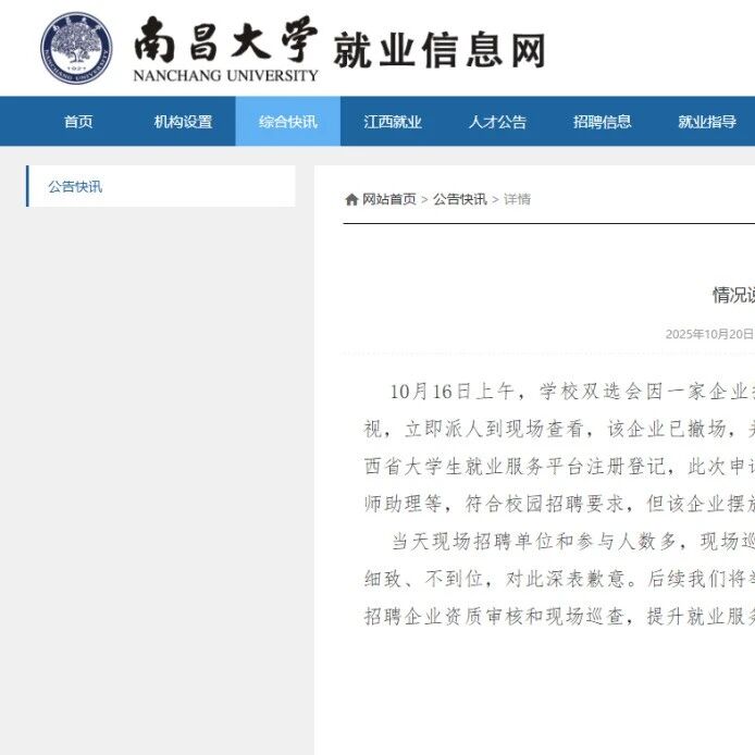 事件概述 - 南昌大学校园双选会因一家企业摆放未报备的招聘海报引发网友讨论 [1] - 事件发生于10月16日上午 [1] - 涉事企业展位号后带有南昌大学标识 [1] 校方回应与处理 - 学校高度重视并于10月20日发布情况说明 [1] - 校方立即派人到现场查看 发现该企业已撤场并将招聘物料带走 [1] - 校方承认现场巡查工作存在疏漏 工作不细致不到位并深表歉意 [1] 涉事企业资质与岗位 - 该企业已在江西省大学生就业服务平台注册登记 [1] - 企业申请入校招聘的岗位包括人事专员、主播、剪辑师助理等 [1] - 校方核查后认为其岗位符合校园招聘要求 [1] 后续改进措施 - 校方表示将举一反三 完善工作制度 [1] - 后续将进一步加强入校招聘企业资质审核和现场巡查 [1] - 旨在提升就业服务质量 [1]
