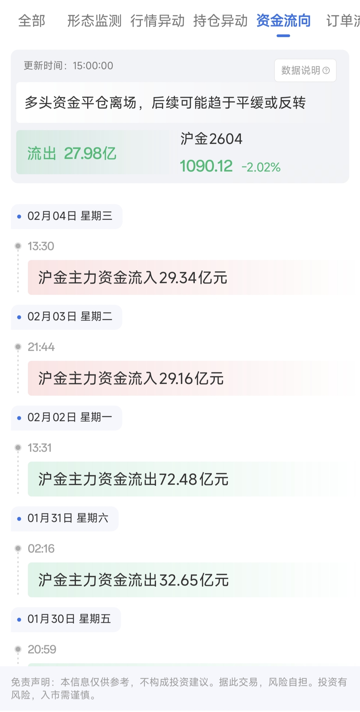 产品功能定位 - 该功能是金投网APP中“沪银天眼盯盘”的特色模块,旨在帮助用户实时监测各品种的资金流入流出情况 [1] - 该功能支持用户免费查看,当资金量发生显著变化时会及时提示,以帮助用户把握市场动向 [1] 功能使用与数据展示 - 用户需进入金投网APP的“沪银天眼盯盘”核心界面,点击“资金流向”功能模板进入查看 [1] - 功能提供实时更新的资金流向数据,并包含智能提醒(例如:多头资金平仓离场,后续可能趋于平缓或反转) [3] - 功能支持用户免费查看以往时间段的历史资金流向数据 [3] - 历史数据显示,沪银主力资金在特定日期有显著流动,例如:02月04日13:30流入20.86亿元,同日另有资金流出59.19亿元 [4] 资金流向分析意义 - 资金流向是判断市场情绪和趋势的重要指标之一,通过观察其变化可以了解市场活跃程度和投资者交易意向 [5] - 资金流入(页面显示为红色背景)通常预示着市场的上行潜力,而资金流出(页面显示为绿色背景)可能预示着市场的下行压力 [5] 功能特性与市场分析建议 - 该资金流向功能具备实时监测能力,能准确捕捉市场资金动向,并在第一时间向用户发出提示 [5] - 在实际应用中,建议将资金流向指标与价格走势、持仓量变化、成交量等其他市场因素结合,进行多维度综合分析以获得更全面的市场视角 [6]