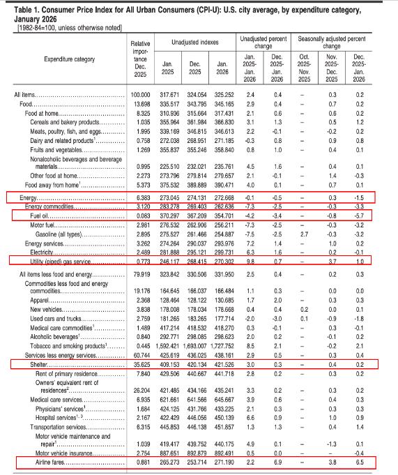 美国1月CPI数据概览 - 美国1月CPI环比上涨0.2%,低于去年12月未修正的0.3%的涨幅 [4] - 1月CPI年率从2.7%回落至2.4%,创2025年5月以来新低,低于市场预期的2.5% [4] - 1月未季调核心CPI环比上涨0.3%,符合预期,年率从2.6%回落至2.5%,创2021年3月以来新低 [4] 通胀主要驱动因素 - 住房成本是推动通胀的主要因素,1月住房指数环比上涨0.2%,是整体CPI环比上涨的最大贡献项 [4] - 服务价格环比上涨0.4%,高于12月0.3%的涨幅,主要受机票价格6.5%的暴涨拉动 [5] - 医疗保健成本上涨0.3%,其中医院服务价格飙升0.9%,医生服务价格上涨0.3% [5] 通胀拖累因素 - 能源分项指数环比下降1.5%,其中燃油价格环比大跌5.7% [7] - 管道燃气服务价格上涨1%,大概率反映出1月寒潮期间供暖需求上升 [7] - 二手车及卡车价格下降1.8%,机动车保险下降0.4% [8] 市场与机构解读 - 市场分析认为通胀同比增速回落主要因去年同期高基数效应消退 [8] - 联博首席经济学家指出,家庭更关注物价绝对水平及食品、药品、租金等生活必需品的价格,这些品类涨幅快于整体通胀 [8] - 太平洋投资管理公司PIMCO经济学家认为报告令人鼓舞,指出住房价格正在放缓,关税相关影响正在逐渐消失,预计今年再降息两次是合理的 [9] 美联储政策前景 - 联邦基金利率期货显示,市场对6月降息概率一度升至70%,年内三次降息概率则重新回到50% [9] - 部分美联储官员态度谨慎,达拉斯联储主席洛里·洛根认为当前货币政策立场已能较好应对风险,克利夫兰联储主席贝丝·哈马克称评估降息效果时宁可偏向保持耐心 [10] - 美联储以PCE为通胀目标,基于CPI数据,华尔街对1月核心PCE通胀环比涨幅的预估区间为0.2%-0.5%,同比涨幅预估区间为2.9%-3.2% [12] 其他相关影响与预测 - 有机构预计,受进口关税传导、去年美元对主要贸易伙伴货币贬值影响,今年通胀接下来将阶段性回升 [12] - 安永-帕特侬高级经济学家预计今年上半年通胀将保持一定粘性,政府停摆导致的数据采集缺口对CPI通胀造成的下行偏差将持续扭曲数据至4月 [12] - 高通胀担忧蔓延,澳大利亚联储本月早些时候宣布加息 [11]