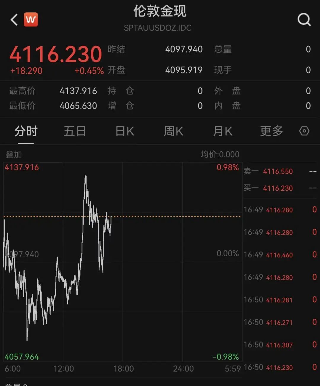 每经编辑|程鹏 4381美元的历史高点还没站稳,本周二(10月21日)国际金价一日内暴跌近300美元至每盎司4082美元,日内跌幅高达6%以上,创下2013年以来最大单日 跌幅。无独有偶,当天白银现货价格也大跌7.5%至每盎司48.37美元。在随后的周三,国际金价继续走低,今天(23日),现货黄金先是下跌再直线拉 升,走出类"V"字行情。 | < W | 伦敦金现 | | | | | | | Q | | --- | --- | --- | --- | --- | --- | --- | --- | --- | | | SPTAUUSDOZ.IDC | | | | | | | | | 4116.230 "F | | | | 4097.940 | | 总量 | | 0 | | +18.290 | +0.45% 开幕 | | | 4095.919 | | Fill Fire | | 0 | | 最高价 | 4137.916 | ਵਿ | 仓 | | 0 | 9 물 | | 0 | | 最低价 | 4065.630 | 博 | 仓 | 0 | | 内 | | 0 | | 分时 | 五日 | | 日K | 旨K | | ...