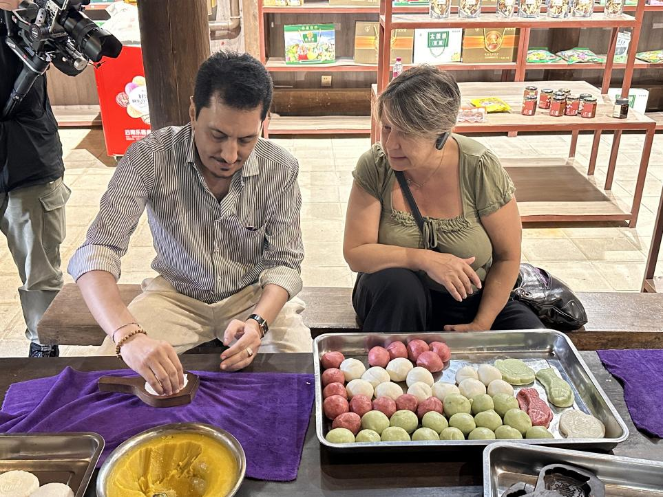 木杵砸进石臼,蒸熟的米粒在一次次撞击中从散粒变成团块,最终化作光滑绵韧的米团。在云南腾冲司莫拉佤族村,《巴基斯坦观察家报》董事长兼总 编辑费萨尔·马利克踏在结实的舂杵上体验制作大米粑粑,脸上掩不住好奇与欣喜。 接下来,费萨尔·马利克学着将温热的米团放进木雕模具,模具内里刻着"寿"字雕花图案。按压平整后,模具倒扣在竹匾上,轻轻敲击模具底部,一个 洁白无瑕、印着精致花纹的米粑便完整地脱落下来。土砌的火塘里,经过烤制,混合着炭香与米香的雾气蒸腾而起,迅速弥漫整个屋子。 9月20日上午,国际传播"丝路奖"采风行团队来到位于云南省腾冲市清水乡三家村中寨的司莫拉佤族村,在这个有着500多年历史的佤族聚居村寨,大米 粑粑正是佤族新年传统食物。 体验了制作工序后,费萨尔·马利克兴奋地说:"这是我第一次见到这样的制作工艺,让我感到非常惊讶!做好的大米粑粑再加上一款口味独特的辣酱, 味道非常值得尝试。" 目前,村内建成农家乐10户,民宿4家,从事农特商品售卖40户,36名村民参加餐厅务工和景区保洁、讲解、秩序维护等实现稳定就业。建成具有浓厚 司莫拉风情的大米粑粑加工厂、幸福餐厅、幸福书吧等,为当地村民提供就业岗位60余个。 费萨 ...