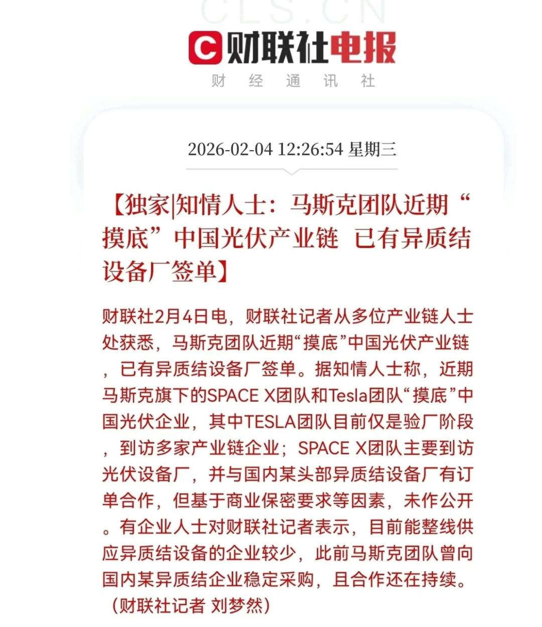文章核心观点 - 埃隆·马斯克旗下SpaceX团队近期密集走访中国多家光伏龙头企业 进行产业链考察 重点涉及异质结和钙钛矿等前沿技术 但目前仅为初步接触和技术交流 尚未达成明确的订单协议[1] - 此次考察与SpaceX和特斯拉联合推进的长期光伏产能规划密切相关 计划未来三年内在美国建设总计200GW的光伏产能 旨在为地面数据中心和太空AI卫星供能[2] - 太空光伏在能量密度和发电小时数上具有显著优势 而异质结与钙钛矿技术因其特性契合太空环境需求 成为考察重点 相关消息刺激A股光伏板块出现大幅上涨[2] 事件概述 - 市场消息称 SpaceX团队近日到访中国多家光伏企业 并与国内某头部异质结设备厂商达成订单合作[1] - 经业内人士向中国证券报记者证实 马斯克团队确实走访了TCL中环 晶盛机电等多家中国光伏企业[1] - 此次考察覆盖光伏产业链多个核心领域 包括光伏设备 硅片及电池片等关键环节 其中异质结 钙钛矿两大前沿技术路线的相关企业是考察重点[1] 1 企业回应与现状 - TCL中环有关负责人表示 公司向马斯克团队展示了组件技术相关内容 目前仅为初步接触 未涉及具体合作意向或订单[1] - 多位被走访企业相关人士及业内知情者表示 目前仅完成初步接触 就技术储备 生产能力等进行了沟通 暂未透露任何关于订单合作的具体情况 也未签署公开协议[1] 1 考察背景与产能规划 - 此次走访或与马斯克团队的中长期光伏产能规划相关[2] - 马斯克近日表示 SpaceX与特斯拉将联合推进光伏产能建设 计划未来三年内在美国打造200GW光伏产能 双方各承担100GW[2] - 这些产能的核心用途是为地面数据中心及太空AI卫星供能[2] 2 技术路线聚焦原因 - 太空光伏具备无昼夜交替 无天气干扰 光照强度更高等天然优势[2] - 太空光伏能量密度较地面提升7-10倍 发电小时数较地面提升4-7倍 且不占用土地资源[2] - 异质结 钙钛矿技术契合太空光伏对超薄 抗辐射电池的量产需求[2] - 钙钛矿在效率增长 适应太空极端环境 轻质柔性和成本端具备优势[2] - 异质结电池产线自动化程度高 所需人工少 适合规模化生产[2] 2 市场反应 - 相关消息公布后 A股光伏板块大涨 板块内个股掀“涨停潮”[2] - 泽润新能 中来股份等股“20CM”涨停 亚玛顿 TCL中环等多股涨停 晶盛机电涨近13% 东方日升涨近7%[2] 2