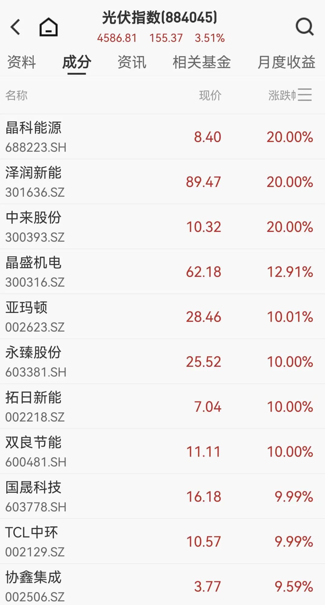 市场表现 - 2月4日午后,光伏板块整体大幅上涨,出现“涨停潮” [1][11] - 晶科能源股价迅速拉升至20%涨停,报8.4元/股,公司总市值达到840亿元,买一挂单量超过1.6亿手 [1][11] - 东方日升股价同步冲高,涨幅超过15% [5][15] - 泽润新能、中来股份股价均达到20%涨停,亚玛顿、双良节能、拓日新能等多只股票延续涨停状态 [7][17] - 根据列表数据,晶科能源、中来股份、泽润新能涨幅均为20.00%,晶盛机电涨13.00%,亚玛顿涨10.01%,双良节能、拓日新能、永臻股份涨10.00%,国晟科技涨9.99%,天合光能涨9.22%,艾能聚涨8.55%,东方日升涨8.02%,首航新能涨7.55%,美辰股份涨7.46% [8][18] 事件驱动 - 市场传闻称,马斯克团队近期秘密走访了中国多家光伏企业,考察范围覆盖设备、硅片、电池组件等环节,并重点考察了拥有异质结、钙钛矿技术路线的企业 [8][18] - 晶科能源工作人员证实,公司近期确实与马斯克团队相关考察团有过接触,考察团了解了公司的技术储备与生产设备,但未透露合作意向及具体细节,该工作人员同时透露马斯克团队对国内主流光伏企业均有考察 [9][19] 行业背景与战略动向 - 马斯克此前在达沃斯论坛上肯定中国光伏产业,指出中国太阳能年装机容量超过1000GW,配合储能的稳态供电可达250GW,相当于美国全年用电量的一半 [9][19] - 马斯克表示,SpaceX与特斯拉正同步推进太阳能产能提升,目标是在未来三年内实现每年100GW的太阳能制造能力,以用于地面数据中心和为太空AI卫星供能 [9][19] - SpaceX近期宣布收购马斯克旗下的人工智能企业xAI,马斯克称此次合并是实现SpaceX“下一个篇章”的一步,计划在轨道上建造比地球效率更高的巨型光伏电站,并与人工智能数据中心相结合 [9][19] - 中金公司研报指出,在商业航天发展背景下,太空光伏作为电源系统升级的核心方向,正迈向技术升级与产业化交付的新阶段,随着中国低轨星座进入密集部署期、单星功率提升及太空算力等新场景探索,建议关注太空光伏带来的全产业链变革 [10][20]