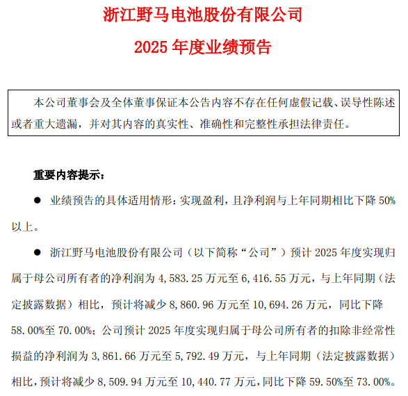 产品单价、出口退税率双双下滑,野马电池2025年净利最高预降70%