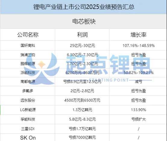 文章核心观点 - 2025年锂电池产业链整体业绩显著回暖,尤其是正极材料端扭亏为盈趋势明显,电芯、负极、电解液、隔膜、铜箔等环节也呈现复苏或增长态势 [1][2][6][9] - 行业回暖主要受益于新能源汽车及储能市场需求快速增长,其中储能电池对厂商利润贡献更大,高端产能争夺与技术路线竞争激烈 [3][6][7] - 中国电池产业链与韩国三大电池厂格局分化加剧,中国凭借完善的产业生态和磷酸铁锂技术路线优势持续领先,而韩系电池厂因市场选择和技术路线问题陷入困境 [10][11][12] 电芯环节业绩表现 - 多家电芯企业2025年业绩预告显示盈利大幅改善或扭亏为盈:国轩高科利润25亿元-30亿元,同比增长107.16%-148.59%;瑞浦兰钧利润6.30亿元-7.30亿元,扭亏为盈;鹏辉能源利润1.70亿元-2.30亿元,扭亏为盈;派能科技利润6200万元-8600万元,同比增长50.82%-109.21%;多氟多利润2亿元-2.8亿元,扭亏为盈;远东股份利润4500万元到6500万元,扭亏为盈 [2] - LG新能源利润1.3万亿韩元,同比增长133.90% [2] - 部分企业仍面临挑战:孚能科技亏损5.8亿元-8.3亿元,亏损扩大;三星SDI亏损1.7万亿韩元;SK On亏损7000亿韩元 [2] 电芯环节好转原因与特点 - 业绩好转根本原因是新能源汽车及储能市场需求快速增长 [3] - 储能电池对厂商利润贡献更大,市场化效果显现,政策推动下收益模式与市场挂钩,利益分配更得当,例如瑞浦兰钧2024年上半年储能电池营收已超过动力电池 [3] - 部分企业通过小众路线实现逆袭,例如多氟多以圆柱电池突围,凭借“氟芯”大圆柱电池的泄压防爆、CTC结构、单侧汇流等技术赢得市场,且其2025年下半年净利润多数来源于第四季度,与六氟磷酸锂涨价曲线重合 [3][4] 正极材料环节业绩表现 - 多数正极材料厂商2025年业绩呈现正增长或亏损收窄:当升科技利润6亿元-6.5亿元,同比增长27%-37%;华友钴业利润58.50亿元-64.50亿元,同比增长40.80%-55.24%;寒锐钴业利润82.9亿元-88.9亿元,同比增长77.78%-90.65%;雅化集团利润6亿元-6.8亿元,同比增长133.36%-164.47% [6] - 天齐锂业利润3.69亿元-5.53亿元,扭亏为盈 [6] - 部分企业亏损收窄:德方纳米亏损7.6亿元-8.6亿元,减亏;龙蟠科技亏损1.4亿元-1.8亿元,减亏 [6] 正极材料行业竞争态势 - 行业价格竞争激烈,转向卷技术,高端产能争夺战异常激烈,高压实磷酸铁锂成为行业热点 [7] - 上游电池厂频繁锁单高端产能,动辄价值数十亿上百亿的长订单落地,供货期限长达三五年甚至更久 [7] - 本轮锁单潮与涨价潮并存,是产业链围绕高端产能资源和定价权的博弈,头部效应明显,宁德时代是最大采购方,楚能新能源异军突起 [7] - 博弈最终趋向互利共赢,电池厂需要稳定供应链,材料厂需要长单确定未来规划 [7] 其他关键材料环节表现 - 负极材料:硅基负极材料量产振奋行业,新能源车叠加储能市场需求传导至负极材料市场反弹,贝特瑞、杉杉股份位于头部,中科星城、尚太科技紧追,广东凯金、江西紫宸、广东东岛等加速前进,硅基负极新秀企业预计2026年崭露头角 [9] - 电解液:自2024年下半年以来,核心原材料六氟磷酸锂、VC等价格持续高位 [9] - 铜箔:2024年呈现强劲增长,产品超薄化是显著趋势,5μm及以下超薄铜箔正集中释放 [9] - 隔膜与设备市场:呈现触底回暖态势,并开始向下一代技术加码 [9] 中韩电池产业格局对比 - 从2024年第四季度开始,韩国三大电池厂除LG新能源外再度陷入亏损,三星SDI和SK On亏损严重 [10] - 市场选择差异导致格局分化:中国电池厂海外市场以东南亚、中东、中欧、东欧、拉美等地为主;韩系电池厂主战场北美、美国及西欧需求放缓,订单被频繁取消 [10] - 技术路线是关键:磷酸铁锂电池已成为全球主流,三元电池市场份额大大萎缩,欧美纯电车型转型缓慢拖累韩系电池厂 [11] - 中国拥有全球最完善的新能源生态,正从走量转向走质量,在电芯制造、精密设备与工艺方面技术逐渐领先,其坚持的磷酸铁锂技术路线在安全性、能量密度和成本上优势明显 [11] - 韩系电池厂正快速转型,大面积将三元产线改为磷酸铁锂产线,并进入储能市场与中国企业博弈,但产线调整需时,且上游锂矿和正极材料对中国依赖加大 [11][12]