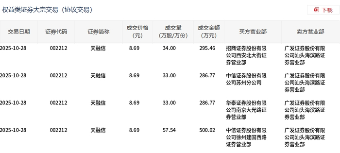 | 交易日期 | 证券代码 | 证券简称 | 成交价格 | 成交量 | 成交舍额 | 买方营业部 | 卖方营业部 | | --- | --- | --- | --- | --- | --- | --- | --- | | | | | (元) | (万股/万份) | (万元) | | | | 2025-10-28 | 002212 | 天戀信 | 8.69 | 34.00 | 295.46 | 招商证券股份有限 | 广发证券股份有限 | | | | | | | | 公司西安北大街证 | 公司汕头海滨路证 | | | | | | | | 器量不出 | 券营业部 | | 2025-10-28 | 002212 | 天融信 | 8.69 | 33.00 | 286.77 | 中信证券股份有限 | 广发证券股份有限 | | | | | | | | 公司苏州分公司 | 公司汕头海滨路证 | | | | | | | | | 券营业部 | | 2025-10-28 | 002212 | 天融信 | 8.69 | 33.00 | 286.77 | 华泰证券股份有限 | 广发证券股份有限 | | | | | | | | 公司南京 ...
