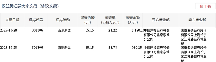大宗交易概况 - 2025年10月28日,西测测试发生大宗交易,总成交量为35万股,总成交金额为1930.25万元,占当日总成交额的5.42% [1] - 大宗交易成交价为55.15元,较当日市场收盘价56.86元折价3.01% [1]   交易明细分析 - 当日共发生两笔大宗交易,成交价格均为55.15元 [2] - 第一笔成交量为21.22万股,成交金额为1170.10万元 [2] - 第二笔成交量为13.78万股,成交金额为760.15万元 [2] - 买方营业部均为中信建投证券股份有限公司北京东城分公司 [2] - 卖方营业部均为国泰海通证券股份有限公司上海长宁区江苏路证券营业部 [2]