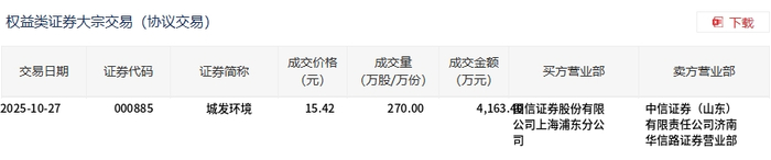交易概况 - 2025年10月27日城发环境发生大宗交易成交270万股成交额4163.4万元占当日总成交额的23.83% [1] - 成交价格为15.42元较市场收盘价15.61元折价1.22% [1] - 买方营业部为围信证券股份有限公司上海浦东分公司卖方营业部为中信证券(山东)有限责任公司济南华信路证券营业部 [2]