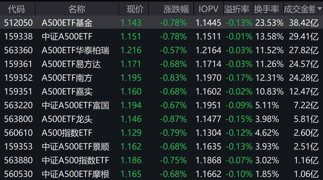 市场早盘震荡调整,中证A500指数下跌0.72%,3只中证A500相关ETF成交额超27亿元