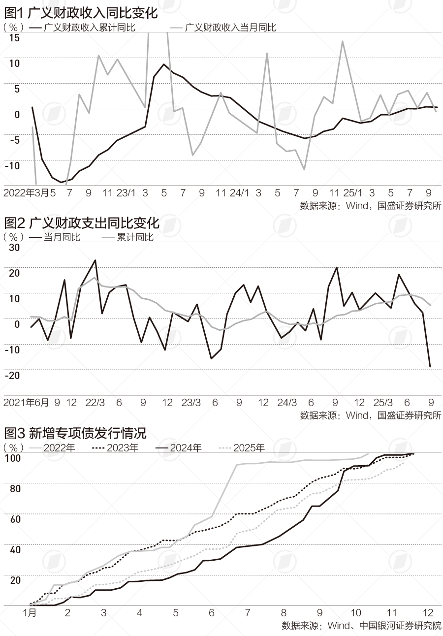 增量政策已经陆续出台。 今年以来中国财政政策更加积极,财政支出保持一定力度,推动经济持续回升向好。 根据财政部最新数据测算,今年前10个月,广义财政(即全国一般公共预算和全国政府性基金预算)收入约22.1万亿元,同比增 长约0.2%;广义财政支出约30.7万亿元,同比增长约5.2%;广义财政支出超过收入约8.6万亿元,同比增长约21%。 广义财政支出规模及增速,是衡量财政政策积极程度的关键指标。在今年以来广义财政收入基本与去年同期持平情况下,广义 财政支出保持5.2%的增速,明显高于收入增速。这说明积极财政政策发力,财政支出保持一定力度。广义财政支出增速与前三 季度经济增速(5.2%)持平,支持了经济平稳运行。 从财政支出结构来看,今年财政资金明显向民生领域倾斜,这也与今年政府工作报告提出推动更多资金资源"投资于人"相契 合。 中国银河证券研报分析认为,去年同期基数走高是支出同比增速下滑的主要原因。另外,新增政府债大量额度在上半年集中使 用,前置发力导致后劲不足。 与民生关联最为紧密的是全国一般公共预算账本。根据财政部数据,今年前10个月,全国一般公共预算支出约22.6万亿元,同比 增长2%。其中与民生关联最 ...