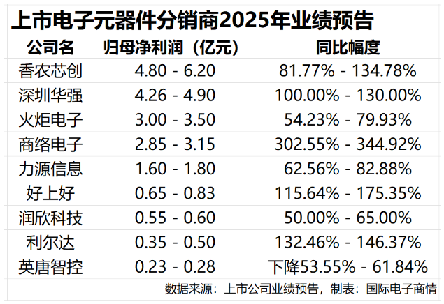 行业整体业绩表现 - 统计的九家A股上市电子元器件分销商中,八家预告2025年归母净利润实现同比增长,仅一家同比下降 [1][22] - 业绩集体预增与全球半导体市场周期性复苏及供应链结构调整相关,多个细分领域出现供需关系变化,部分元器件价格上涨 [2][23] - 从增长幅度看,商络电子以302.55%至344.92%的同比增幅领先,利尔达、好上好及深圳华强预告的增幅也均超过100% [1][22] - 从利润规模看,香农芯创、深圳华强预告的归母净利润区间位居前列,分别达到4.80亿至6.20亿元、4.26亿至4.90亿元 [1][22] 香农芯创 - 预计2025年归母净利润4.80亿元至6.20亿元,同比增长81.77%至134.78% [3][25] - 业绩增长主要受生成式人工智能(AGI)发展驱动,互联网数据中心(IDC)建设带动企业级存储需求增加,公司销售的企业级存储产品数量增长且价格上升,预计全年收入增长超过40% [3][25] - 公司自主品牌“海普存储”已推出企业级SSD及DRAM产品线并进入量产,2025年度预计实现销售收入17亿元,其中第四季度预计13亿元,首次实现年度规模盈利 [4][26] 深圳华强 - 预计2025年实现归母净利润4.26亿元至4.90亿元,同比增长100.00%至130.00% [5][27] - 增长原因包括:深化与本土龙头(如海思、紫光展锐等)及海外优质产品线(如村田、Wolfspeed等)合作,深挖消费电子、汽车电子、新能源、数据中心、存储等领域机会,实现业务规模双增长 [5][27] - 公司“华强科创广场”项目出租率稳居深圳福田区前列,项目业绩稳健提升也对利润增长有所贡献 [6][28] 火炬电子 - 预计2025年实现净利润3.00亿元至3.50亿元,同比增长54.23%至79.93% [6][29] - 报告期内行业景气度提升,公司高可靠领域客户业务推进节奏提速,自产元器件业务订单交付较上年同期大幅增加 [6][29] - 公司持续优化产品结构、改善运营效率,同时贸易类业务积极拓展市场,业务规模扩张为利润增长奠定基础 [6][29] 商络电子 - 预计2025年归母净利润2.85亿元至3.15亿元,同比增长302.55%至344.92% [7][30] - 预计营业收入在82.0亿元至90.0亿元之间,同比增长25.28%至37.50% [7][30] - 业绩大幅上涨原因:聚焦AI、机器人、汽车电子等下游领域优化产品结构,相关产品毛利贡献提升;依托稳定的原厂合作与优化的供应链管理,有效摊薄成本费用 [8][31] 力源信息 - 预计2025年实现营业收入88.5亿元,同比增长13.16%;归母净利润1.60亿元至1.80亿元,同比增长62.56%至82.88% [10][33] - 半导体行业景气度提升,公司AI行业业务(含服务器及电源、光模块等)、工业及新能源业务、安防监控、消费电子、汽车电子业务营业收入均有所增加 [11][34] - 公司物联网卡业务在多个领域推广应用,收入及利润相应增加,同时加大高毛利率业务推广力度,整体业务毛利率有所提升 [11][34] 好上好 - 预计2025年实现归母净利润6500万元至8300万元,同比增长115.64%至175.35% [14][35] - 报告期内行业景气度上行,客户需求增长,公司销售规模扩大;同时毛利率较高的部分产品线销售额增加,推动整体毛利率提升 [14][35] 润欣科技 - 预计2025年归母净利润5455.47万元至6001.02万元,同比增长50%至65% [16][38] - 业绩增长主要因公司在AIoT和汽车电子领域的营业收入实现较快增长,利润同步提升 [16][38] - 公司未来将持续专注于无线超低功耗SoC芯片的场景应用和端侧轻量化模型研发,深耕智能穿戴、AI音视频交互和智能家居市场 [16][38] 利尔达 - 预计2025年归母净利润3500万元至5000万元,上年同期亏损1.08亿元,实现扭亏为盈且同比大幅增长 [18][40] - 增长原因:物联网模块及系统解决方案业务营业收入同比大幅增长;IC增值分销业务去库存、拓渠道取得成效,业绩较上年同期有较大增长;转让部分股权投资带来溢价收益 [18][41] 英唐智控 - 预计2025年归母净利润2300万元至2800万元,同比下降53.55%至61.84% [20][42] - 报告期内存储芯片需求攀升,公司存储业务大幅上涨,整体营业收入较上年同期增加约4.5%,但分销产品毛利承压,毛利率下降约0.7个百分点 [21][42] - 公司加大芯片设计制造业务研发投入,整体研发费用较上年同期增加约65%,导致净利润下降 [21][43]