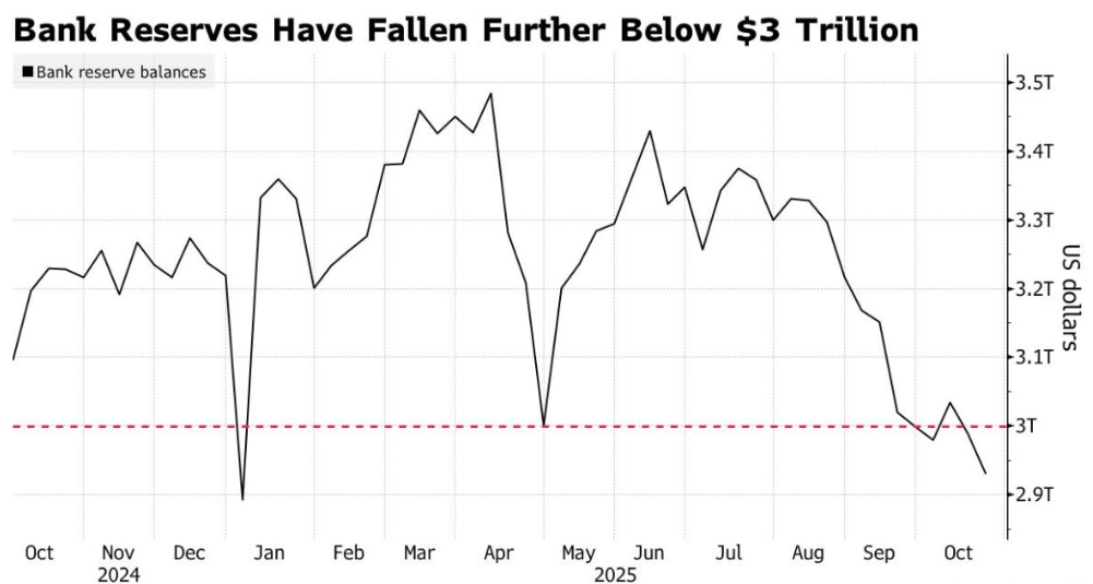 美国银行系统的准备金规模正持续下滑,最近已经连续两周低于3万亿美元的重要关口。截至10月22日的一周,商业银行存在美联储的准备金 又减少了约590亿美元,降到2.93万亿美元,是今年1月以来的最低水平。 美联储用来吸收流动性的逆回购工具,使用规模也在不断萎缩,目前已接近见底。这个工具一度像"蓄水池"一样帮助缓解资金过剩,如今它的 收缩进一步说明整体流动性在收紧。随着逆回购工具渐渐退出舞台,准备金水平成为更受关注的流动性指标。 目前,美联储的资产负债表规模约为6.6万亿美元,通过"量化紧缩"政策持续从市场回收资金。除了利率政策外,美联储如何控制"缩表"节奏也 牵动市场神经。摩根大通、美国银行、道明证券等机构的分析人士都预计,美联储可能很快会停止缩减资产负债表。 为什么准备金在减少? 一个重要原因是美国政府在债务上限提高之后,加大了债券发行力度,以此来补充国库现金。这一行为通过金融体系传导,正在实实在在地收 紧市场上的资金。 流动性收紧不仅表现在准备金下降,也反映在货币市场利率的波动上。尽管月中曾因部分机构集中支付资金,回购市场短暂迎来一些流动性, 但整体来看,货币市场利率仍在走高。有分析认为,回购利率居高不下可 ...